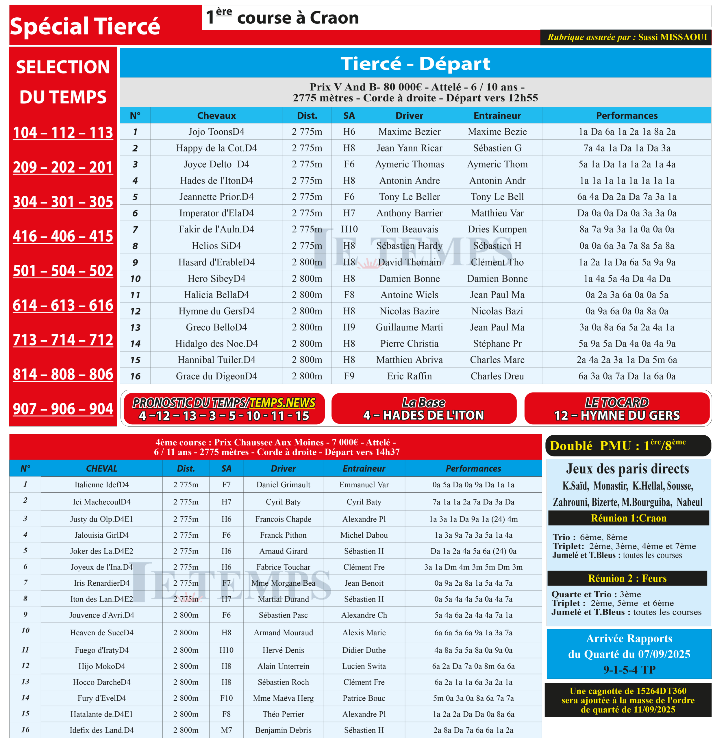 Partager Facebook Twitter LinkedIn Pinterest Email Notre spécial Tiercé d’aujourd’hui, 1ère course à Craon, donne notre pronostic du Temps/ Temps News avec le cheval n°4 Hades De L’Iton étant la base, tandis que le Tocard est le cheval n°12 Hymne Du Gers. PMU Turf