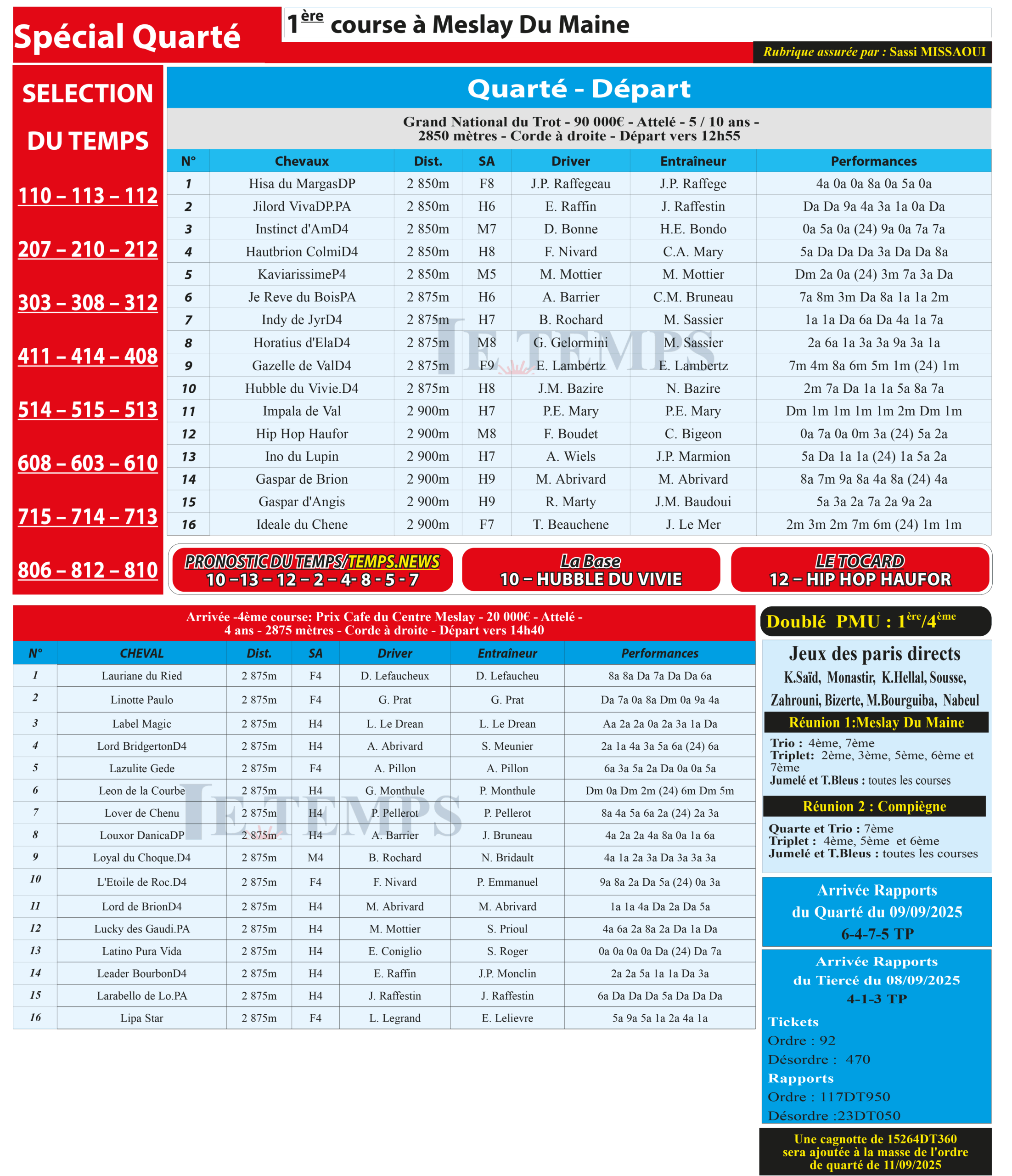 Partager Facebook Twitter LinkedIn Pinterest Email Notre spécial Quarté d’aujourd’hui, 1ère course à Meslay Du Maine, donne notre pronostic du Temps/ Temps News avec le cheval n°10 Hubble Du Vivie la base, tandis que le Tocard est le cheval n°12 Hip Hop Haufor. PMU Turf