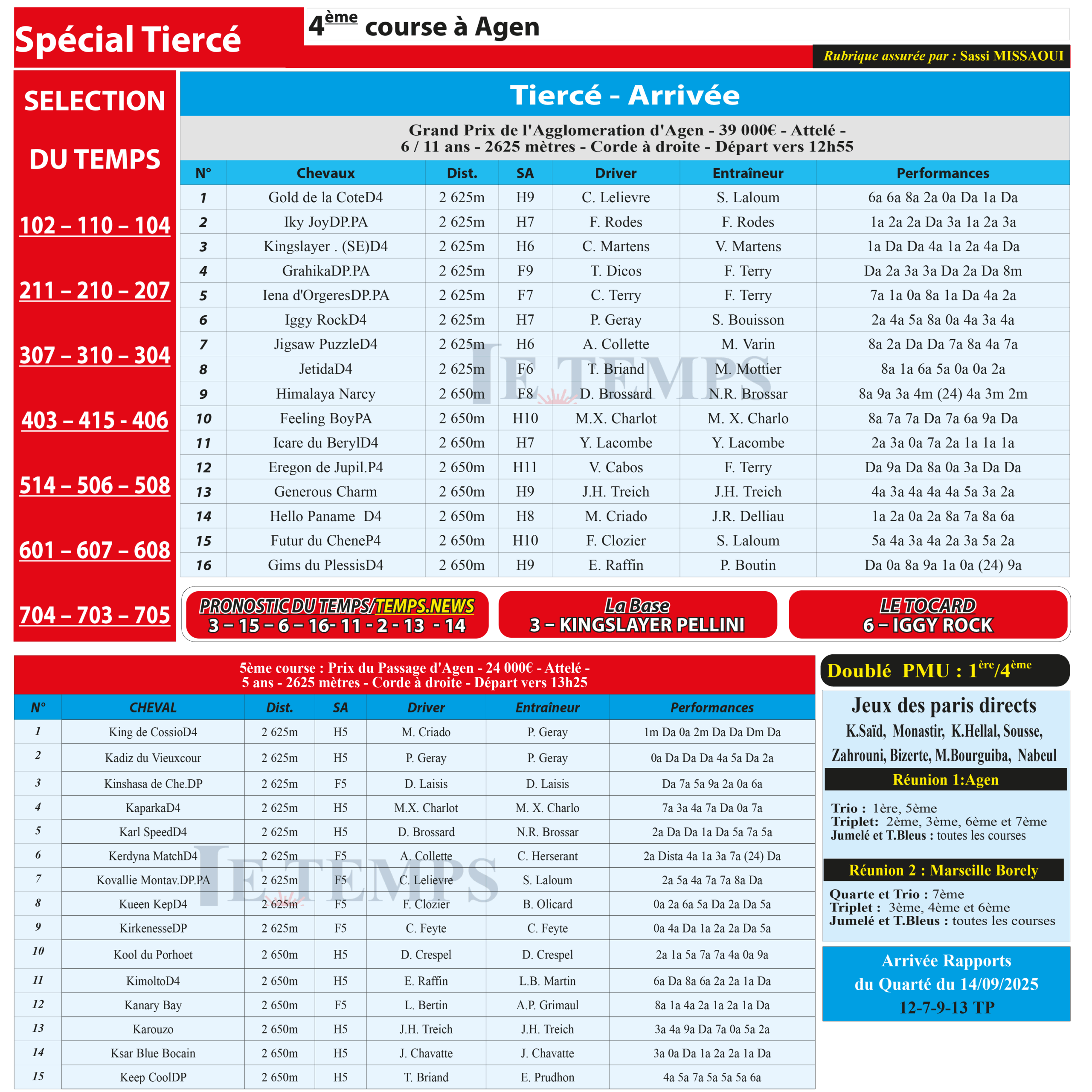 Notre spécial Tiercé d’aujourd’hui, 4ème course à Agen, donne notre pronostic du Temps/ Temps News avec le cheval n°3 Kingslayer Pellini étant la base, tandis que le Tocard est le cheval n°6 Iggy Rock.
