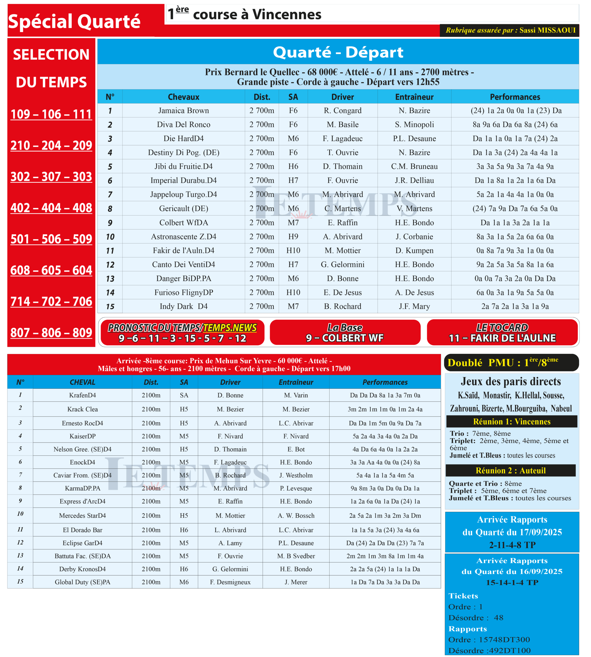 Notre spécial Quarté d’aujourd’hui, 1ère course à Vincennes, donne notre pronostic du Temps/ Temps News avec le cheval n°9 Colbert WF étant la base, tandis que le Tocard est le cheval n°111 Fakir De L’Aulne.