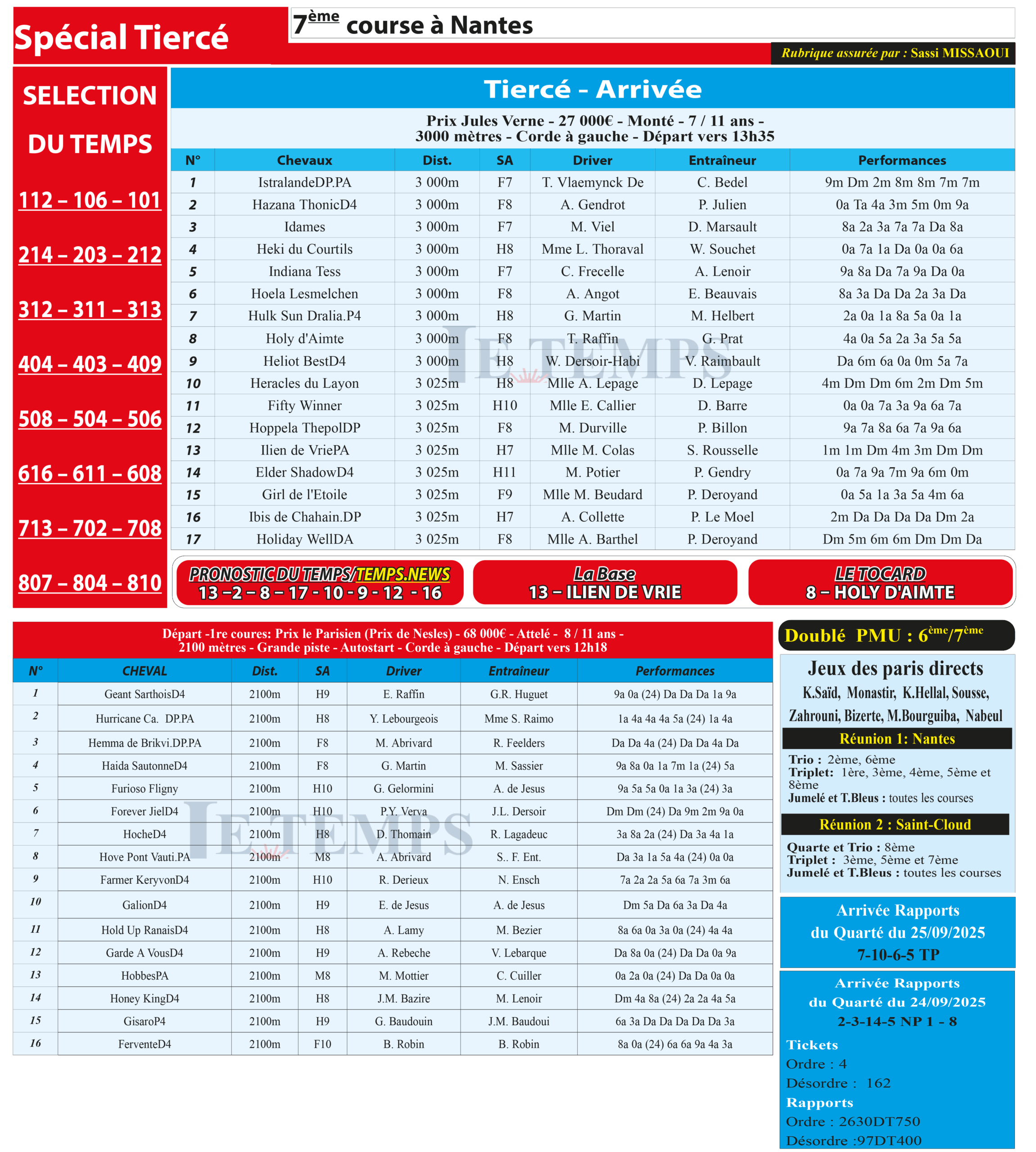 Notre spécial Tiercé d’aujourd’hui, 7ème course à Nantes, donne notre pronostic du Temps/ Temps News avec le cheval n°13 Ilien De Vrie étant la base, tandis que le Tocard est le cheval n°8 Holy D’Aimte.