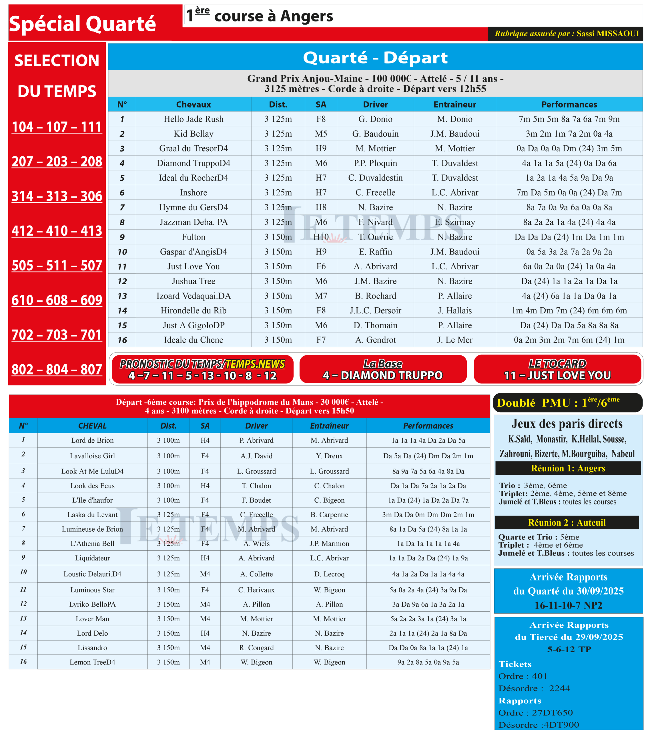 Partager Facebook Twitter LinkedIn Pinterest Email Notre spécial Quarté d’aujourd’hui, 1ère course à Angers, donne notre pronostic du Temps/ Temps News avec le cheval n°4 Diamond Truppo la base, tandis que le Tocard est le cheval n°11 Just Love You. PMU Turf
