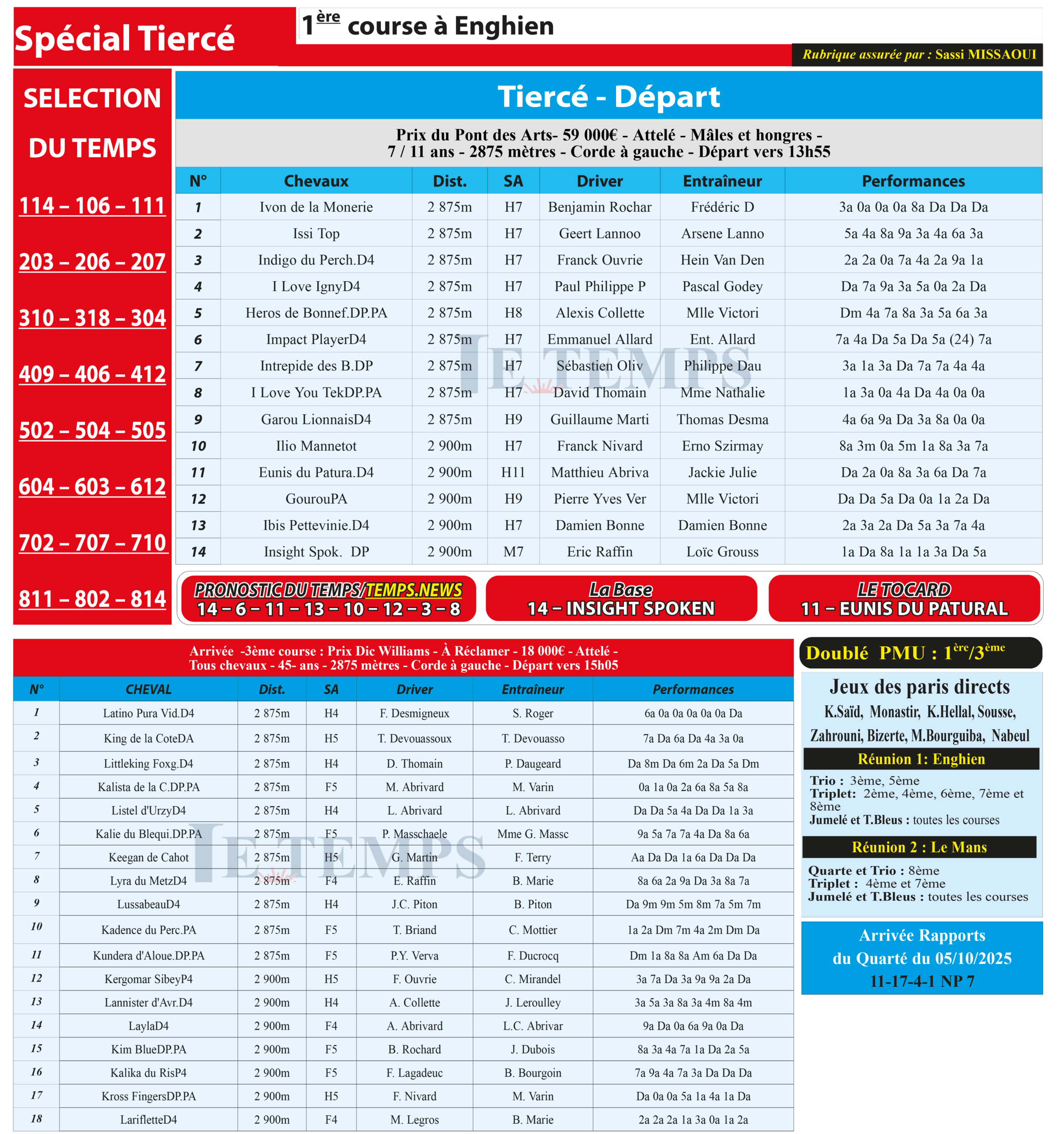 Notre spécial Tiercé d’aujourd’hui, 1ère course à Enghien, donne notre pronostic du Temps/ Temps News avec le cheval n°14 Insight Spoken étant la base, tandis que le Tocard est le cheval n°11 Eunis Du Patural.