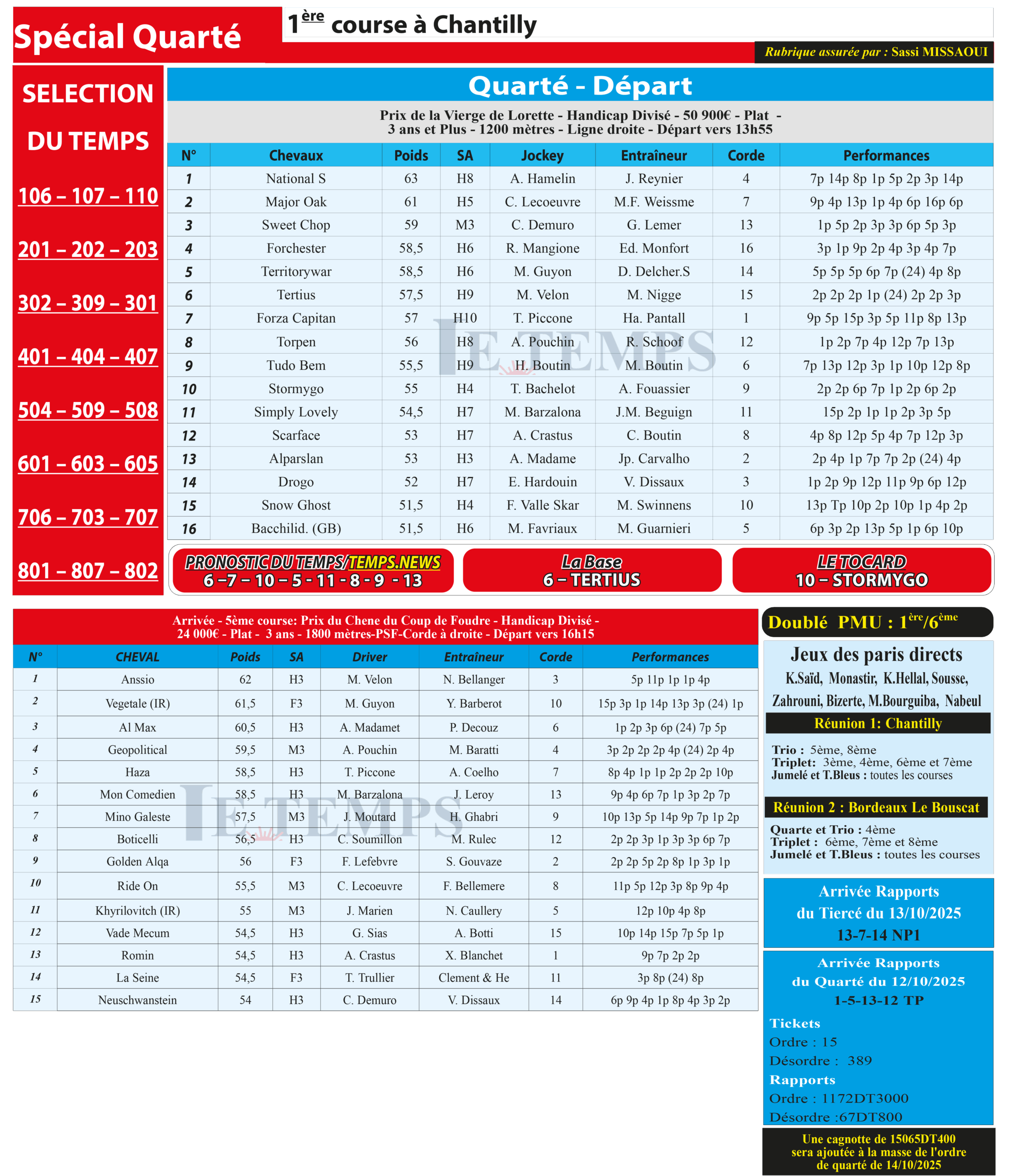 Notre spécial Quarté d’aujourd’hui, 1ère course à Chantilly, donne notre pronostic du Temps/ Temps News avec le cheval n°6 Tertius la base, tandis que le Tocard est le cheval n°10 Stormygo.