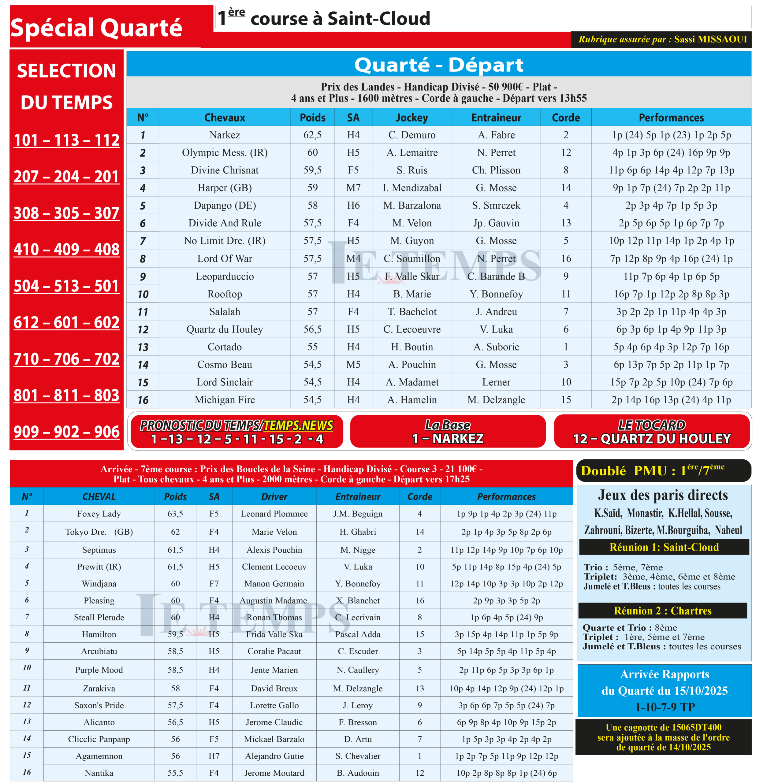 Notre spécial Quarté d’aujourd’hui, 1ère course à Saint-Cloud, donne notre pronostic du Temps/ Temps News avec le cheval n°1 Narkez la base, tandis que le Tocard est le cheval n°12 Quartz Du Houley.