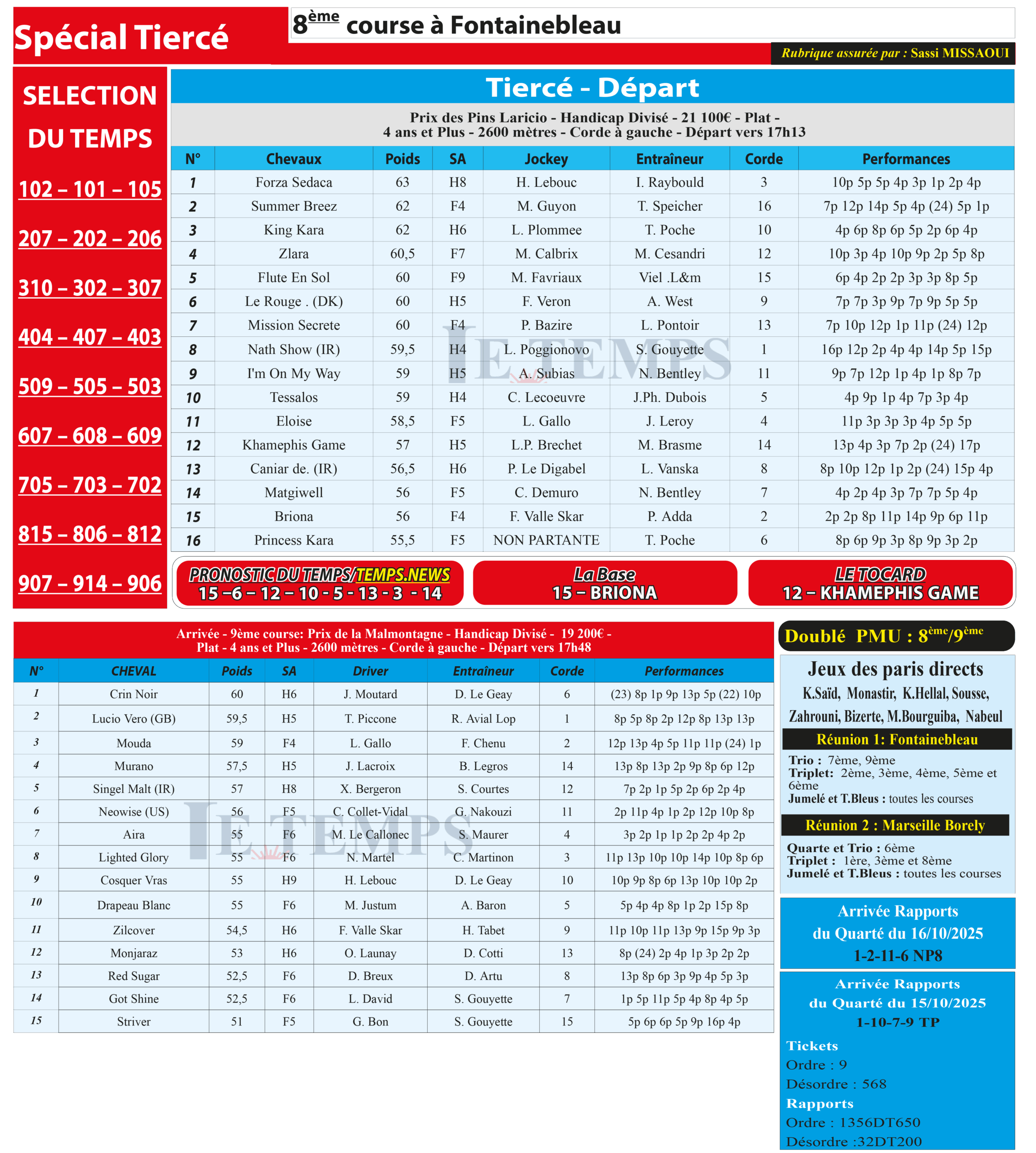 Partager Facebook Twitter LinkedIn Pinterest Email Notre spécial Tiercé d’aujourd’hui, 8ème course à Fontainebleau, donne notre pronostic du Temps/ Temps News avec le cheval n°15 Briona étant la base, tandis que le Tocard est le cheval n°12 Khamephis Game. i PMU Turf