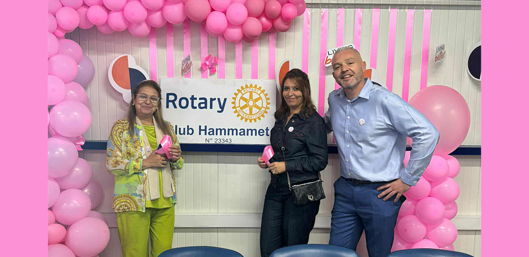 Le cancer du sein, l’une des toutes premières causes de mortalité des femmes, fait l’objet chaque année dans le monde d’une attention particulière à l’occasion d’Octobre rose. Cette opération à laquelle contribuent de nombreux Rotary clubs informe le public des dangers comme des solutions possibles face à cette maladie, soutient des initiatives pour différentes prises en charge de patientes, Qu’il s’agisse de participer au dépistage de la maladie, d’organiser des actions publiques de sensibilisation, le Rotary club d’Hammamet répond présent.