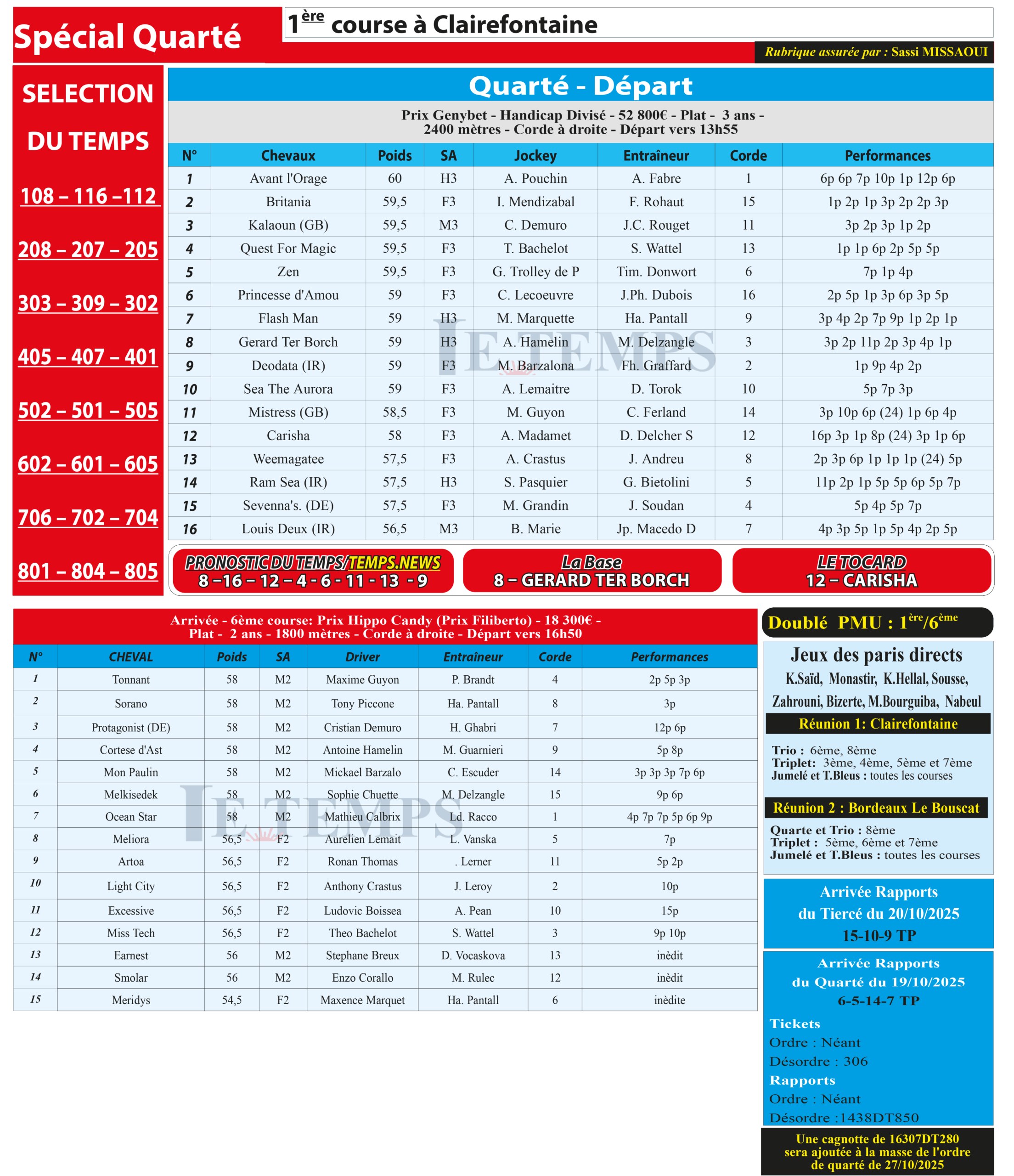 Partager Facebook Twitter LinkedIn Pinterest Email Notre spécial Quarté d’aujourd’hui, 1ère course à Clairefontaine, donne notre pronostic du Temps/ Temps News avec le cheval n°8 Gerard Ter Borch étant la base, tandis que le Tocard est le cheval n°12 Carisha. PMU Turf