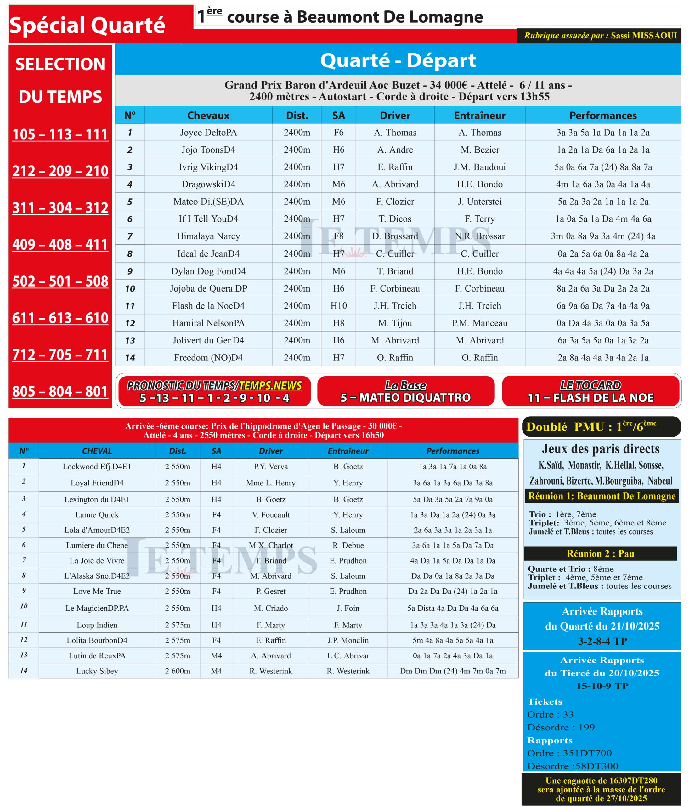 Partager Facebook Twitter LinkedIn Pinterest Email Notre spécial Quarté d’aujourd’hui, 1ère course à Beaumont De Lomagne, donne notre pronostic du Temps/ Temps News avec le cheval n°5 Mateo Diquattro étant la base, tandis que le Tocard est le cheval n°11 Flash De La Noe. PMU Turf