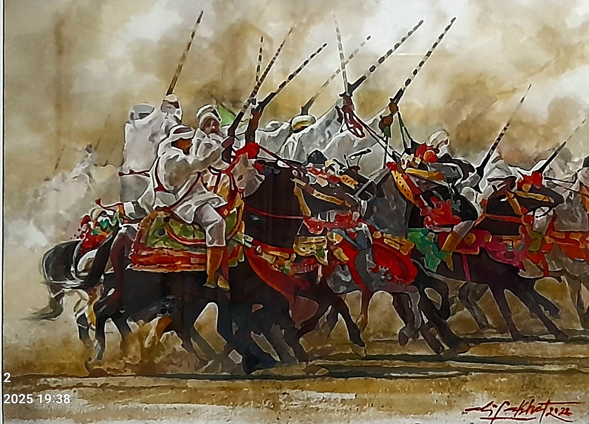 L’artiste Ali Fakhet, spécialiste de dessin et de l’aquarelle, participe avec des œuvres dont le sujet tourne autour du cheval et des cavaliers arabes dans une chevauchée inspirée de la miniature.
