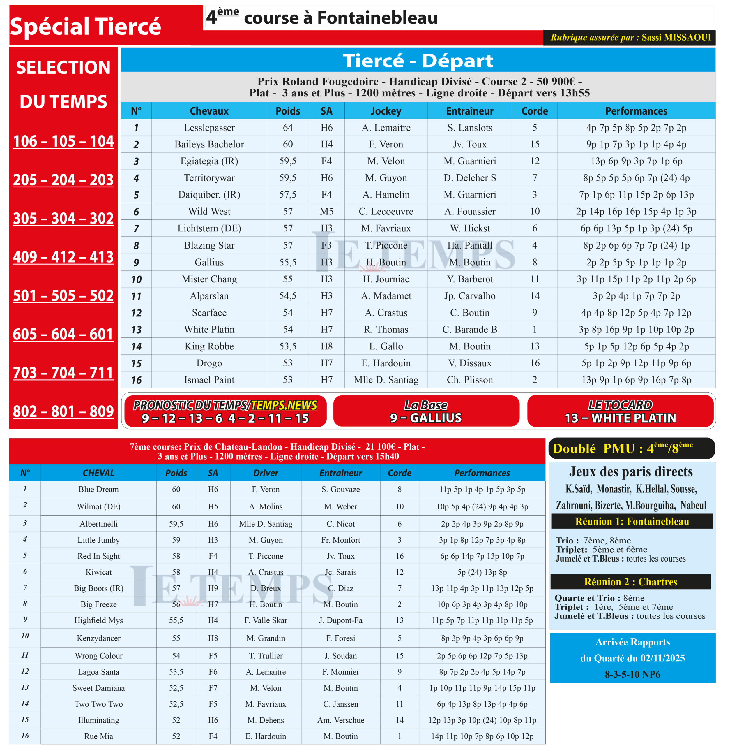 Notre spécial Tiercé d’aujourd’hui, 4ème course à Fontainebleau, donne notre pronostic du Temps/ Temps News avec le cheval n°9 Gallius étant la base, tandis que le Tocard est le cheval n°13 White Platin.