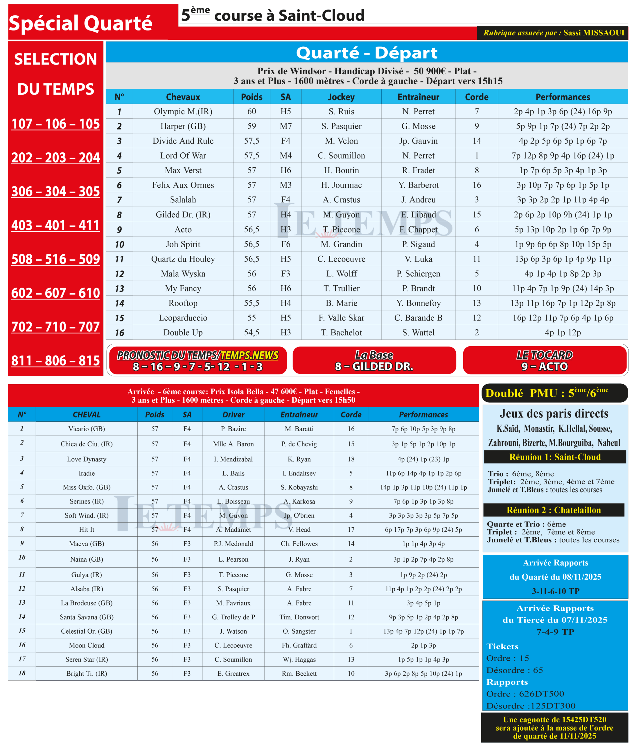 Notre spécial Quarté d’aujourd’hui, 5ème course à Saint-Cloud, donne notre pronostic du Temps/ Temps News avec le cheval n°8 Gilded Dr. étant la base, tandis que le Tocard est le cheval n°9 Acto.