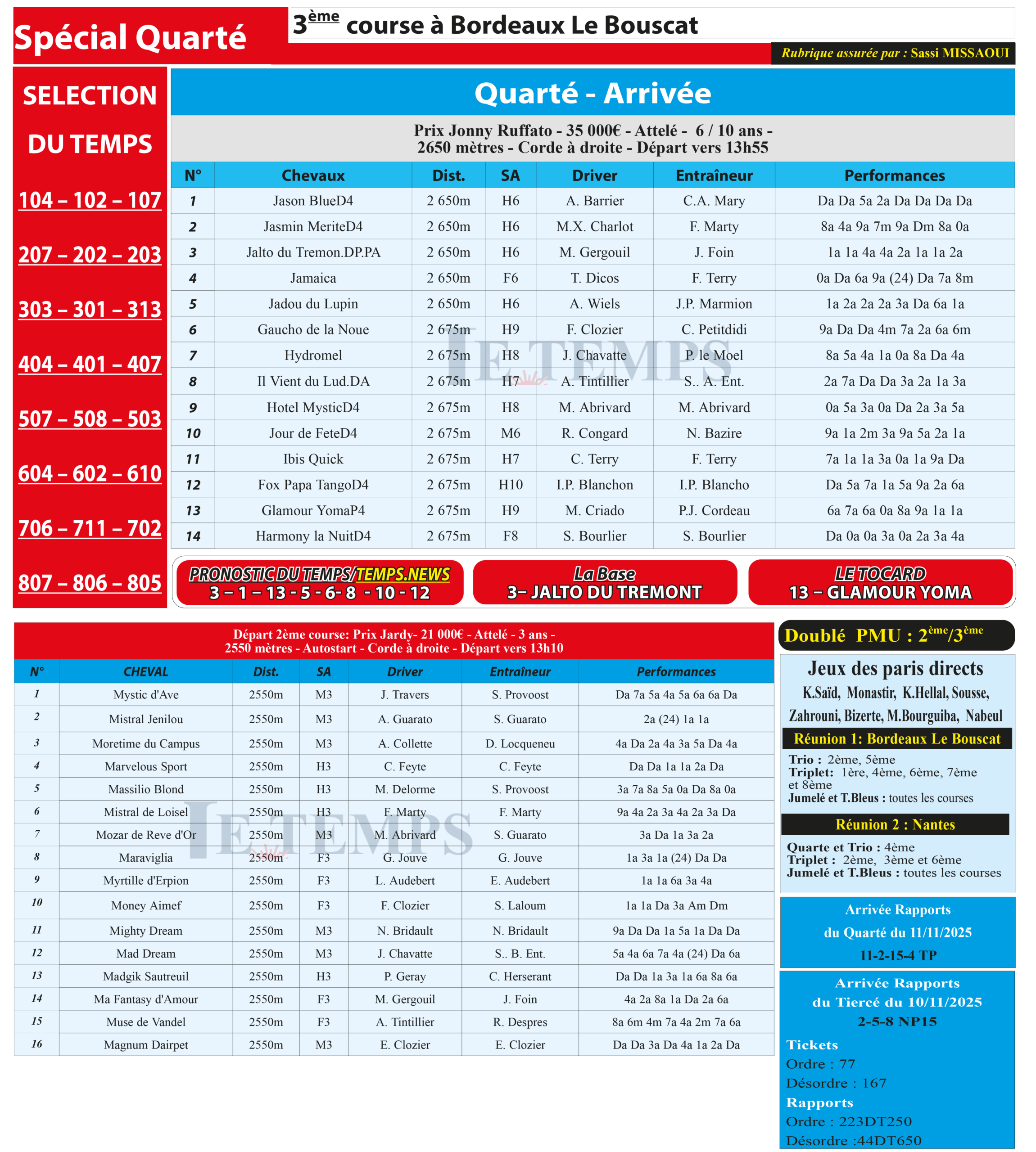 Partager Facebook Twitter LinkedIn Pinterest Email Notre spécial Quarté d’aujourd’hui, 3ème course à Bordeaux Le Bouscat, donne notre pronostic du Temps/ Temps News avec le cheval n°3 Jalto Du Tremont étant la base, tandis que le Tocard est le cheval n°13 Glamour Yoma. PMU Turf