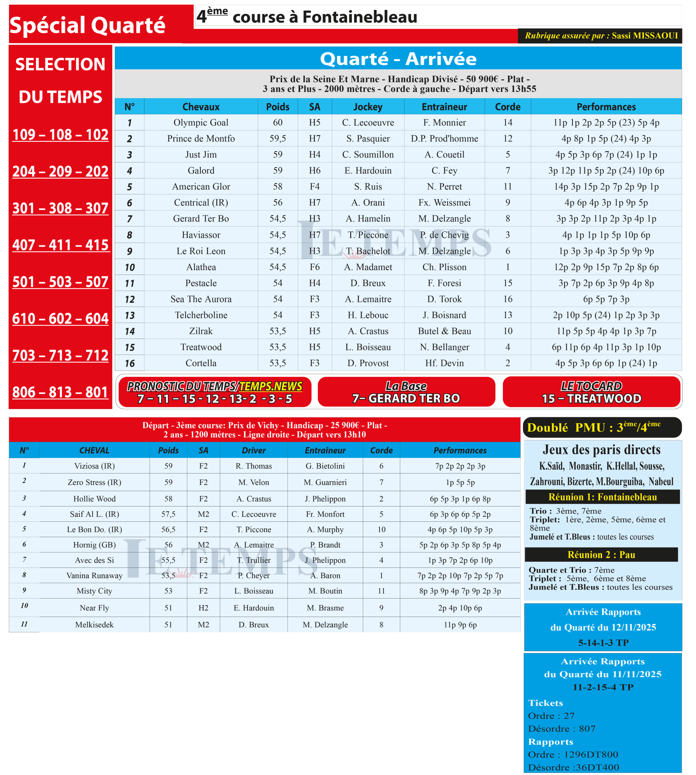 Partager Facebook Twitter LinkedIn Pinterest Email Notre spécial Quarté d’aujourd’hui, 4ème course à Fontainebleau, donne notre pronostic du Temps/ Temps News avec le cheval n°7 Gerard Ter Bo étant la base, tandis que le Tocard est le cheval n°15 Treatwood. PMU Turf