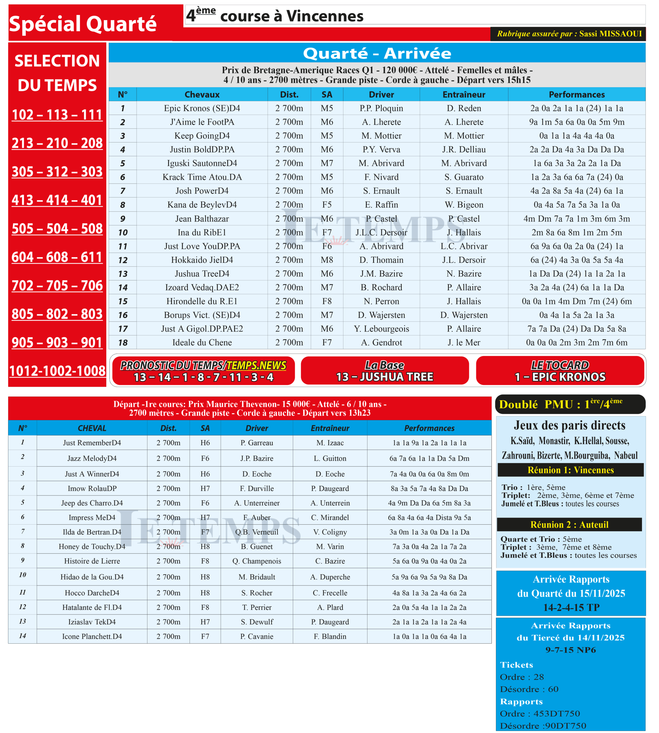 Partager Facebook Twitter LinkedIn Pinterest Email Notre spécial Quarté d’aujourd’hui, 4ème course à Vincennes, donne notre pronostic du Temps/ Temps News avec le cheval n°13 Jushua Tree étant la base, tandis que le Tocard est le cheval n°1 Epic Kronos. PMU Turf