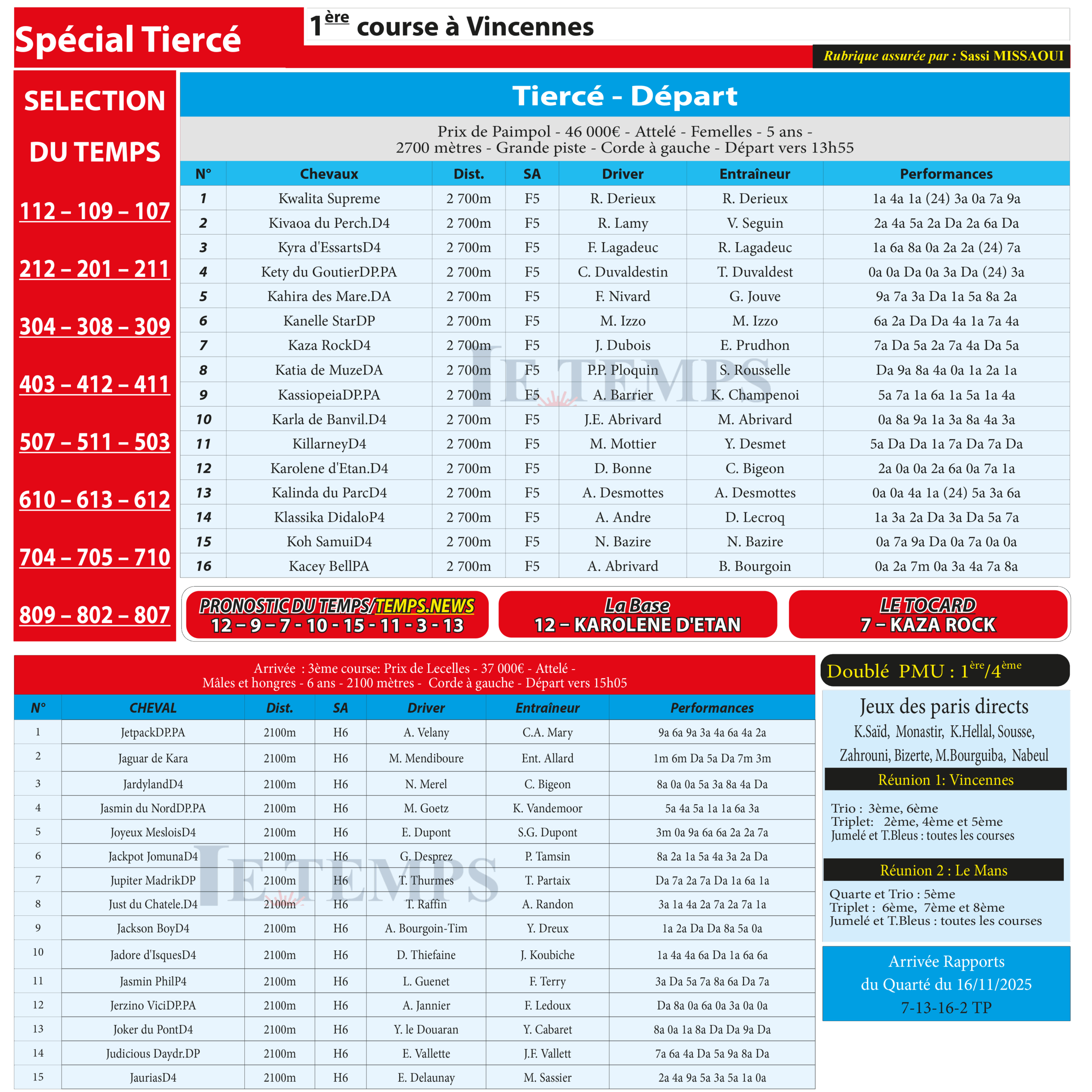Partager Facebook Twitter LinkedIn Pinterest Email Notre spécial Tiercé d’aujourd’hui, 1ère course à Vincennes, donne notre pronostic du Temps/ Temps News avec le cheval n°12 Karolene D’Etan étant la base, tandis que le Tocard est le cheval n°7 Kaza Rock. PMU Turf