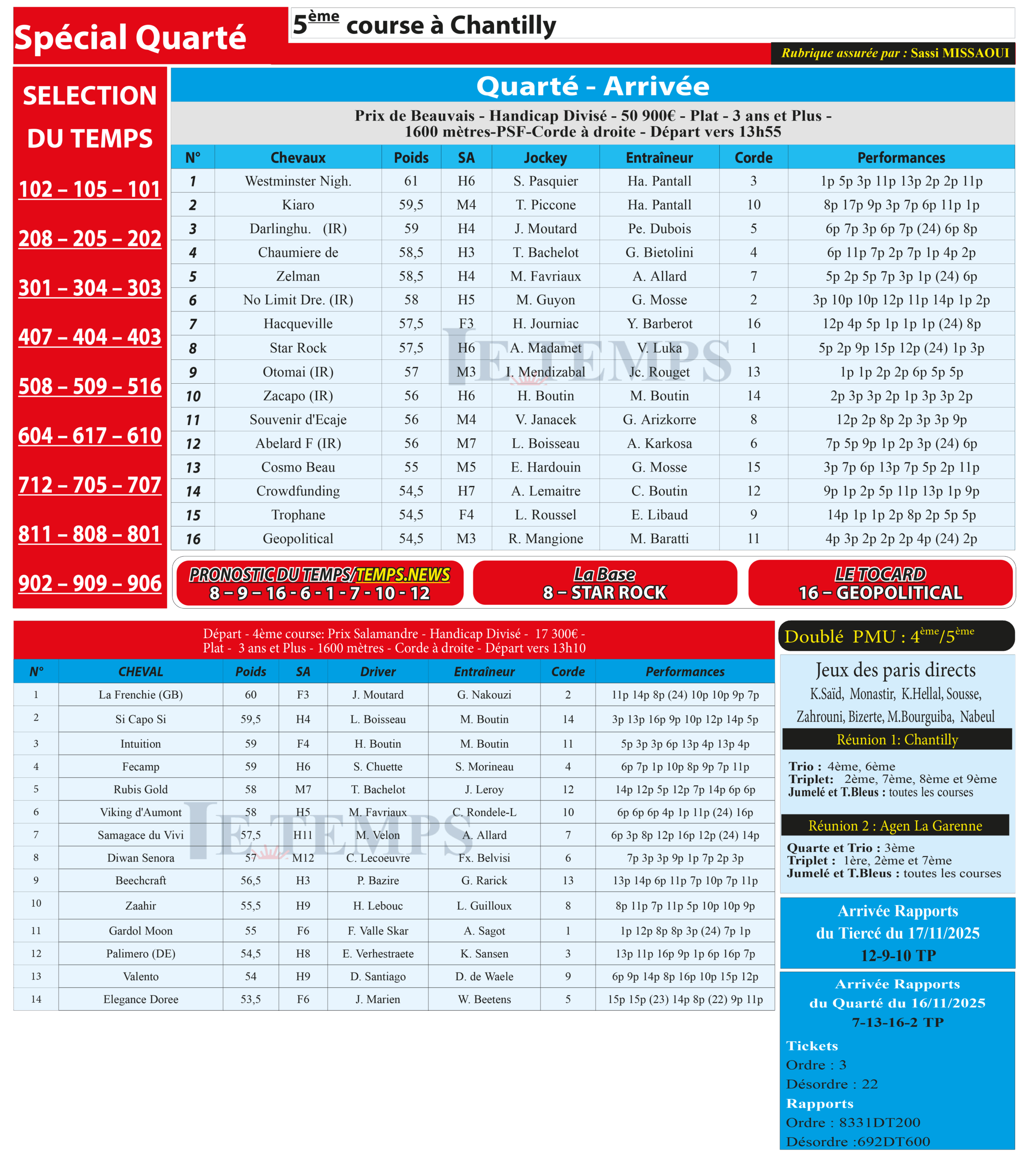 Notre spécial Quarté d’aujourd’hui, 5ème course à Chantilly, donne notre pronostic du Temps/ Temps News avec le cheval n°8 Star Rock la base, tandis que le Tocard est le cheval n°16 Geopolitical.
