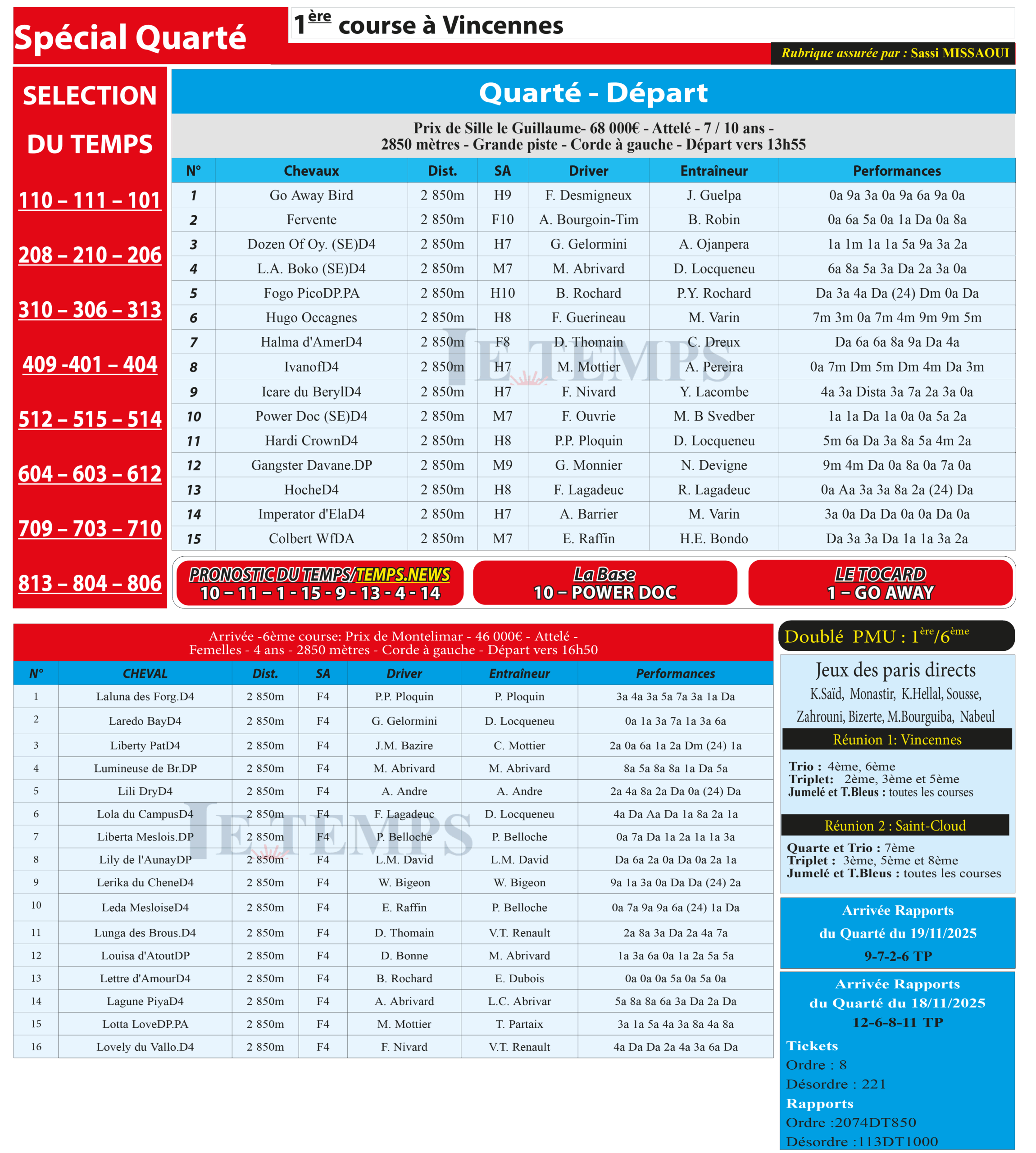 Partager Facebook Twitter LinkedIn Pinterest Email Notre spécial Quarté d’aujourd’hui, 1ère course à Vincennes, donne notre pronostic du Temps/ Temps News avec le cheval n°10 Power Doc étant la base, tandis que le Tocard est le cheval n°1 Go Away. PMU Turf