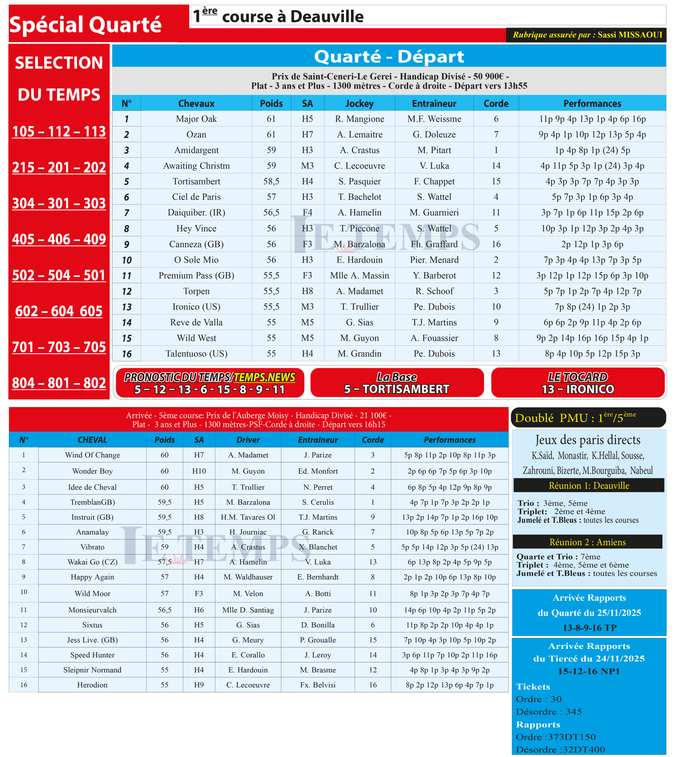 Partager Facebook Twitter LinkedIn Pinterest Email Notre spécial Quarté d’aujourd’hui, 1ère course à Deauville, donne notre pronostic du Temps/ Temps News avec le cheval n°5 Tortisambert la base, tandis que le Tocard est le cheval n°13 Ironico. PMU Turf