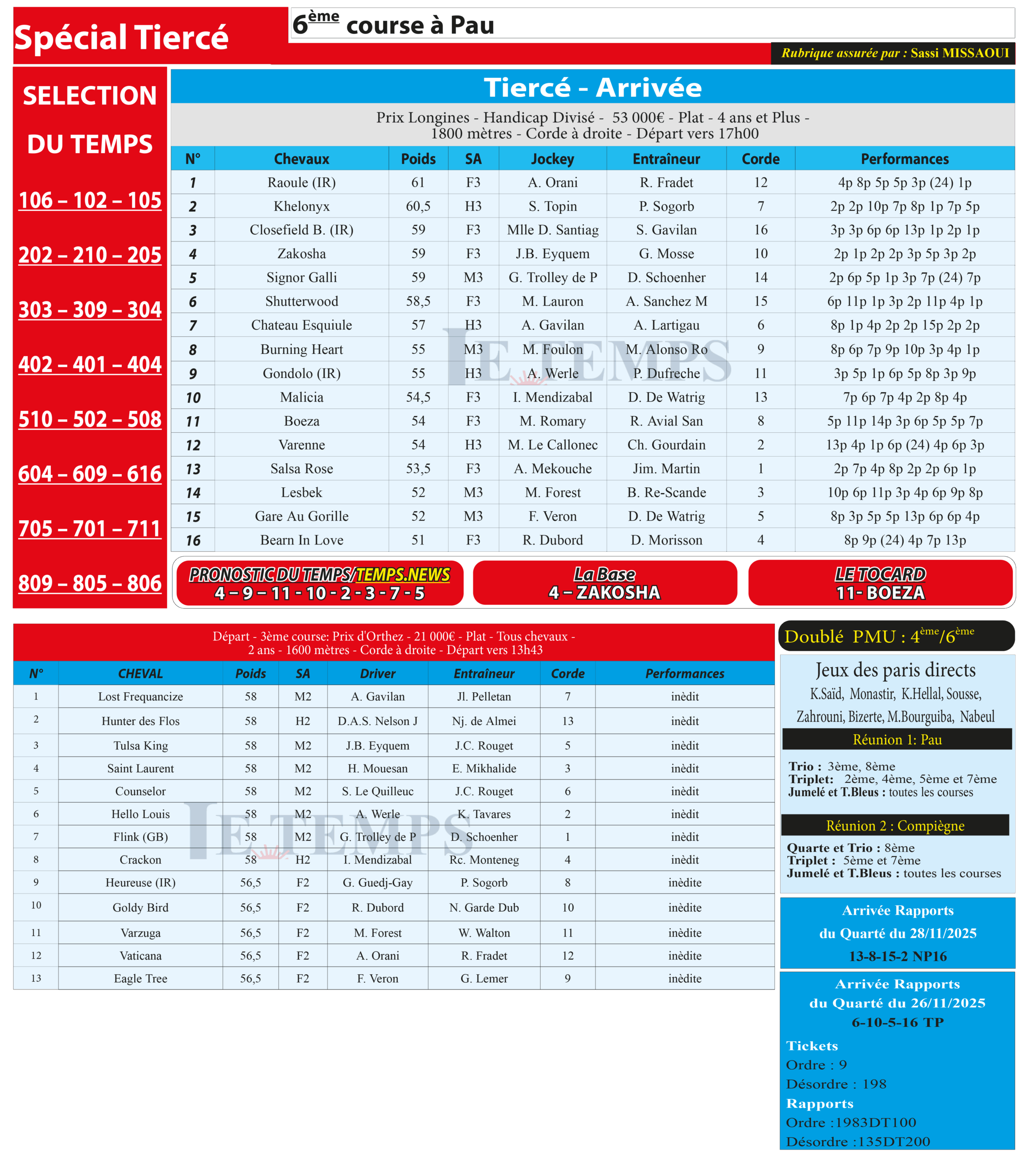 Partager Facebook Twitter LinkedIn Pinterest Email Notre spécial Tiercé d’aujourd’hui, 6ème course à Pau, donne notre pronostic du Temps/ Temps News avec le cheval n°4 Zakosha la base, tandis que le Tocard est le cheval n°11 Boeza. PMU Turf