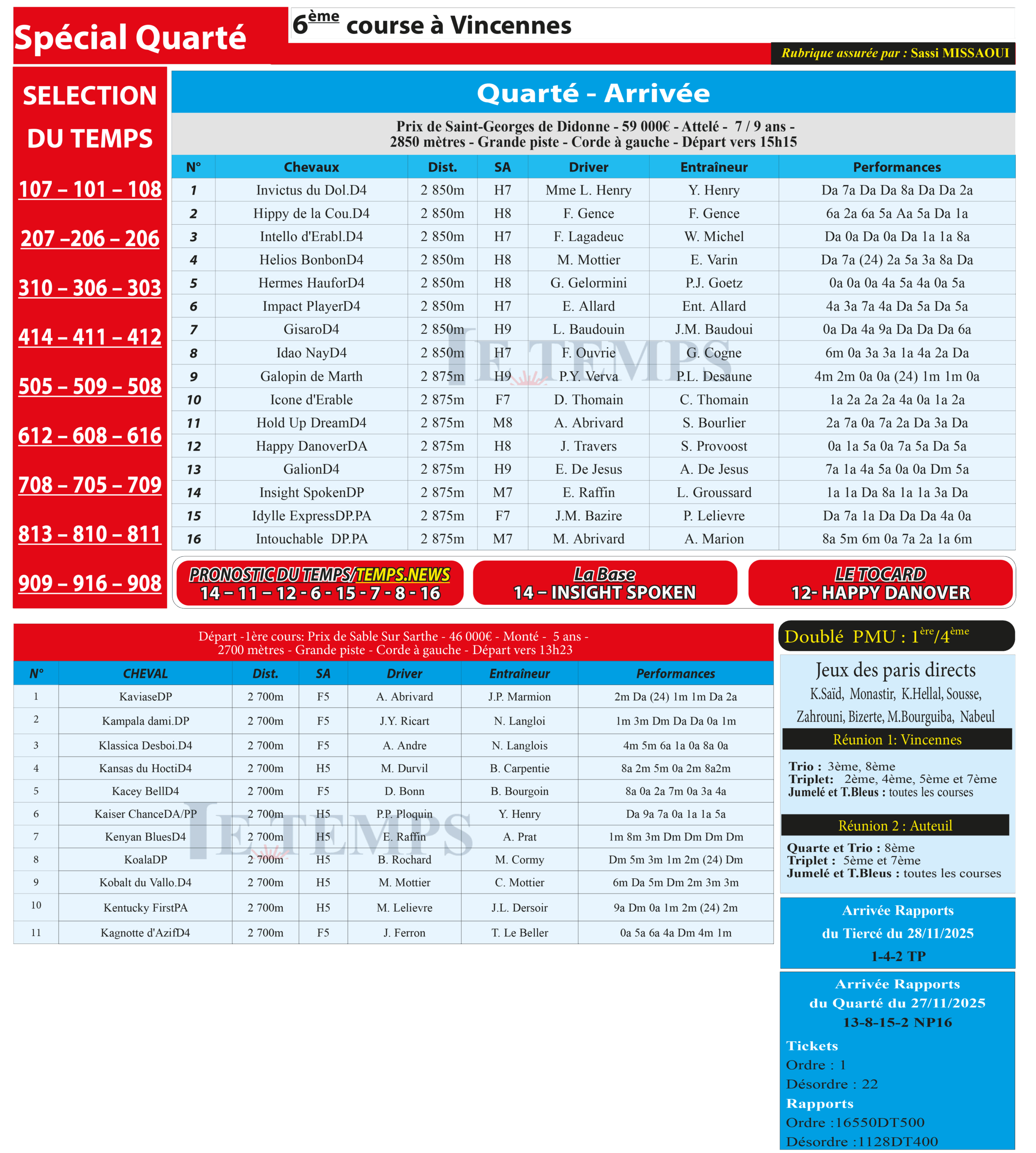 Partager Facebook Twitter LinkedIn Pinterest Email Notre spécial Quarté d’aujourd’hui, 4ème course à Vincennes, donne notre pronostic du Temps/ Temps News avec le cheval n°14 Insght Spoken étant la base, tandis que le Tocard est le cheval n°12 Happy Danover. PMU Turf