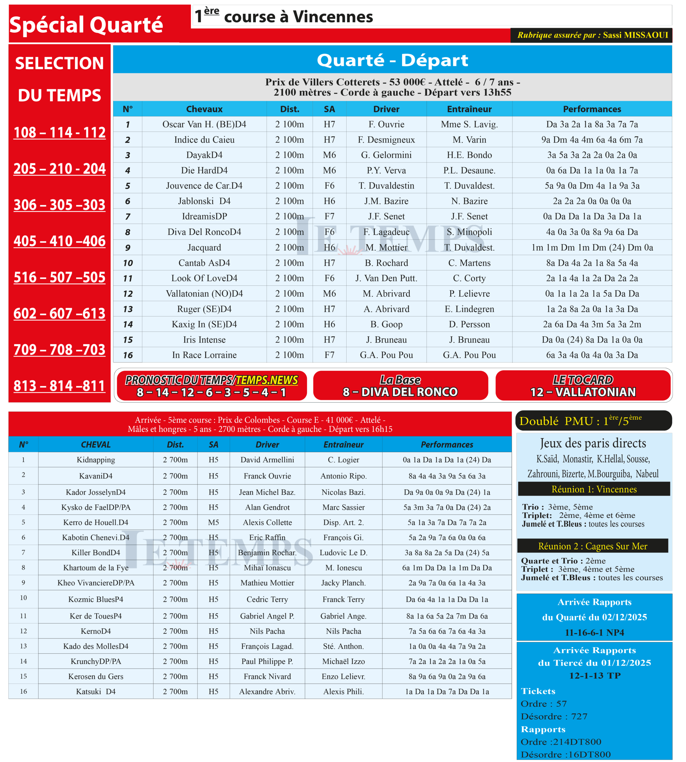 Partager Facebook Twitter LinkedIn Pinterest Email Notre spécial Quarté d’aujourd’hui, 1ère course à Vincennes, donne notre pronostic du Temps/ Temps News avec le cheval n°8 Diva Del Ronco étant la base, tandis que le Tocard est le cheval n°12 Vallatonian. PMU Turf