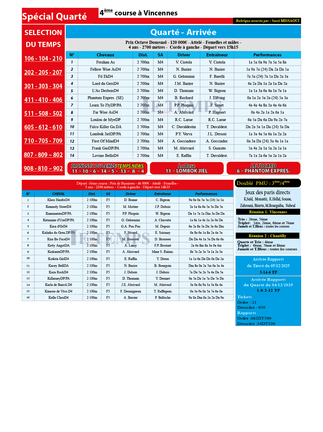 Partager Facebook Twitter LinkedIn Pinterest Email Notre spécial Quarté d’aujourd’hui, 4ème course à Vincennes, donne notre pronostic du Temps/ Temps News avec le cheval n°11 Lombok Jiel étant la base, tandis que le Tocard est le cheval n°6 Phantom Expres. PMU Turf