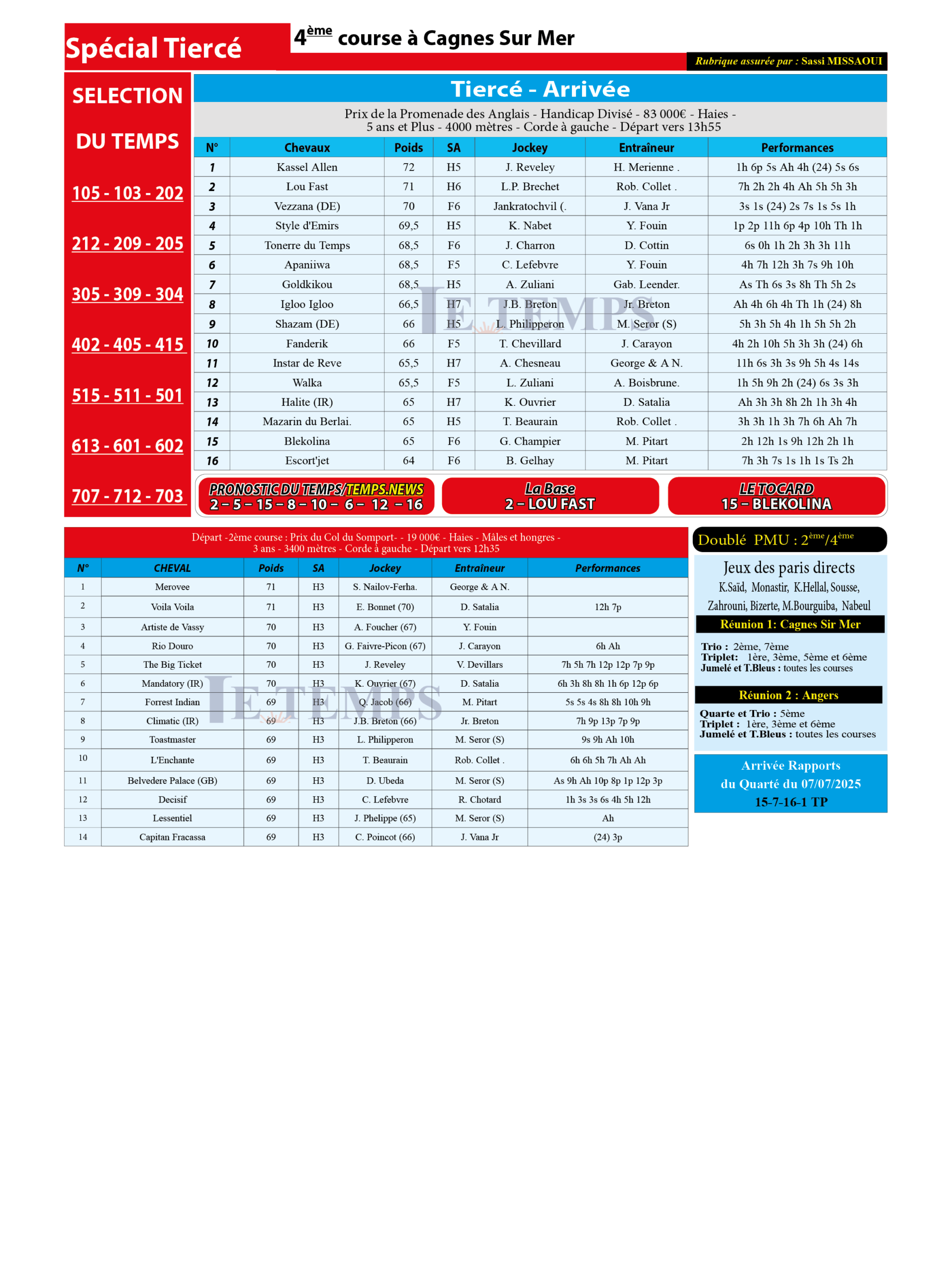 Partager Facebook Twitter LinkedIn Pinterest Email Notre spécial Tiercé d’aujourd’hui, 4ème course à Cagnes Sur Mer, donne notre pronostic du Temps/ Temps News avec le cheval n°2 Lou Fast la base, tandis que le Tocard est le cheval n°15 Blekolina. PMU Turf