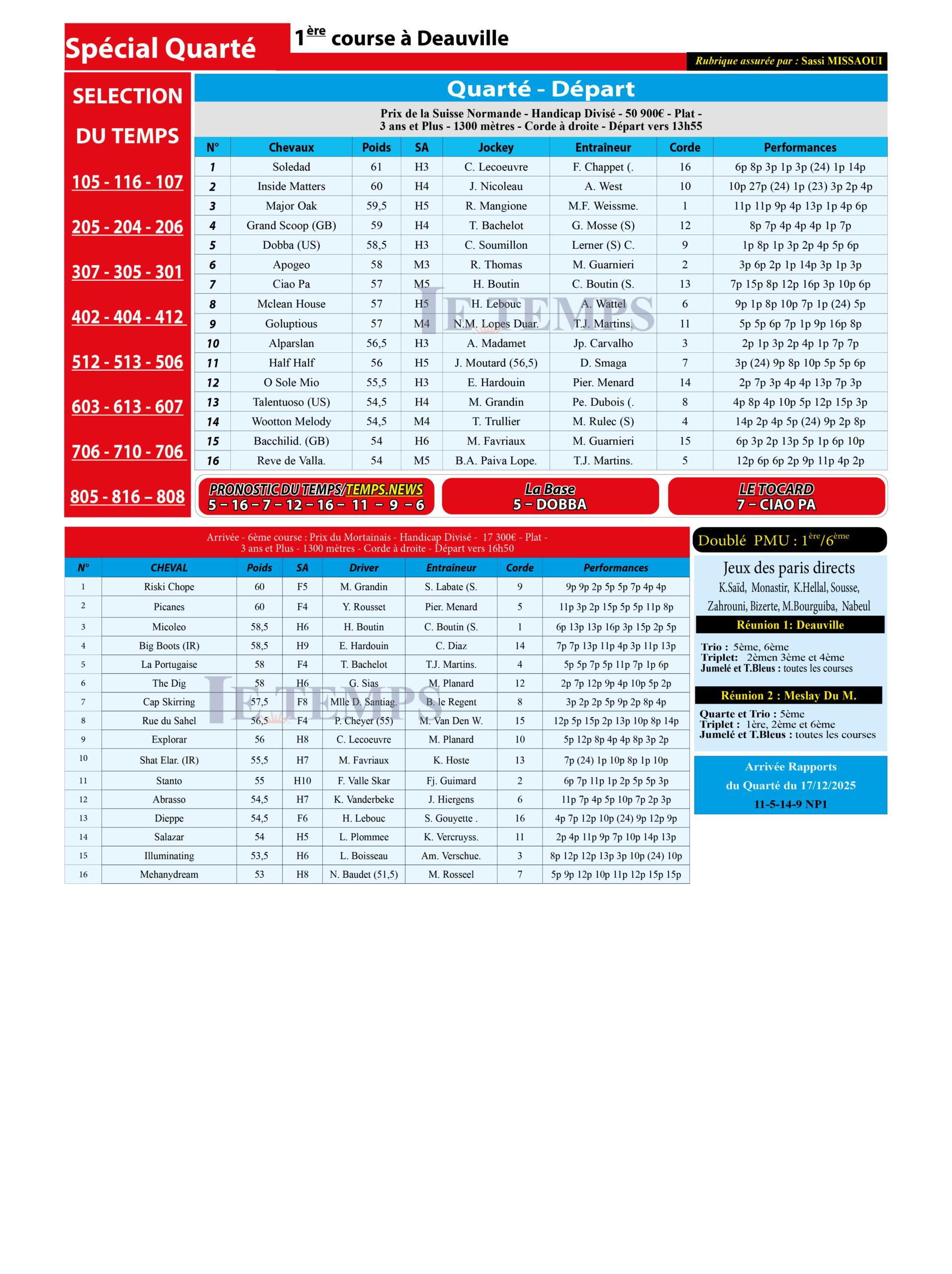 Partager Facebook Twitter LinkedIn Pinterest Email Notre spécial Quarté d’aujourd’hui, 1ère course à Deauville, donne notre pronostic du Temps/ Temps News avec le cheval n°5 Dobba De la base, tandis que le Tocard est le cheval n°7 Ciao Pa. PMU Turf