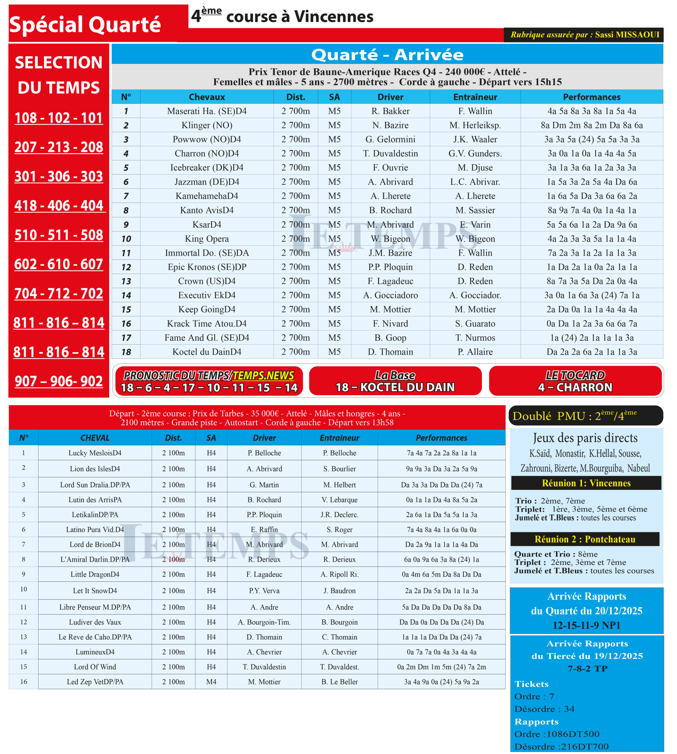Partager Facebook Twitter LinkedIn Pinterest Email Notre spécial Quarté d’aujourd’hui, 4ème course à Vincennes, donne notre pronostic du Temps/ Temps News avec le cheval n°18 Koctel Du Dain étant la base, tandis que le Tocard est le cheval n°4 Charron. PMU Turf