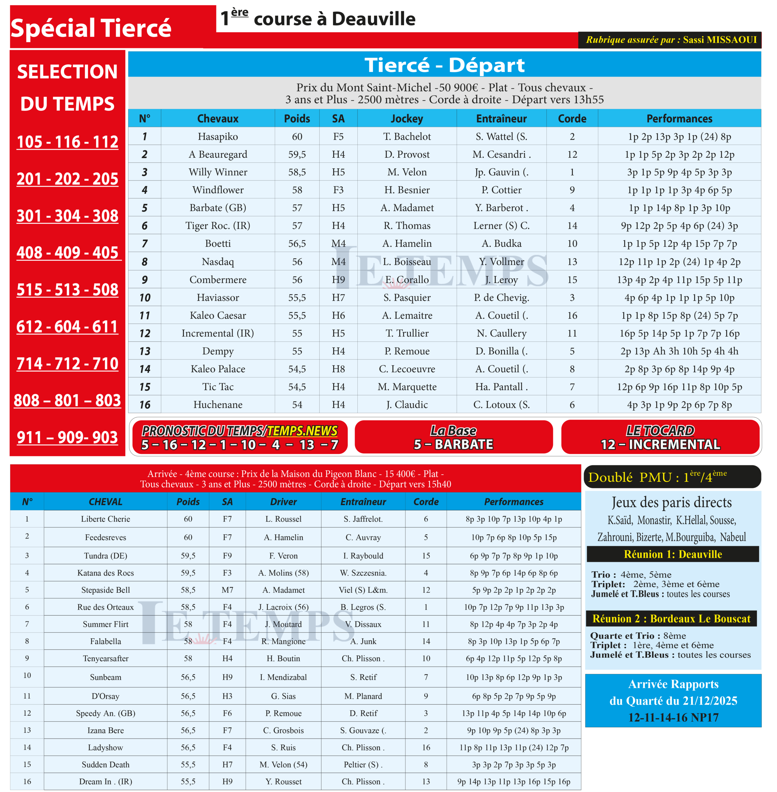 Notre spécial Tiercé d’aujourd’hui, 1ère course à Deauville, donne notre pronostic du Temps/ Temps News avec le cheval n°5 Barbate étant la base, tandis que le Tocard est le cheval n°12 Incremental.