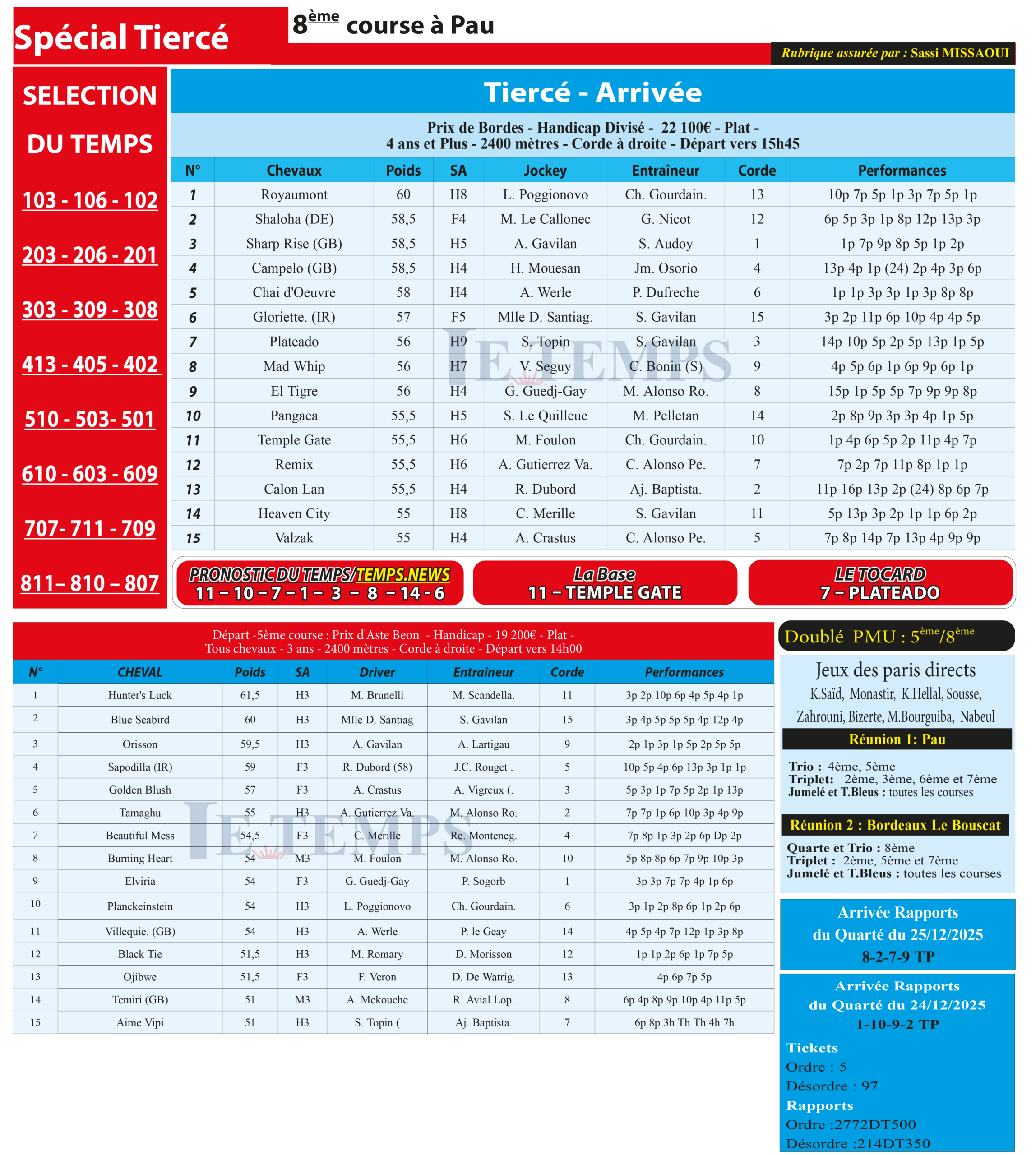 Partager Facebook Twitter LinkedIn Pinterest Email Notre spécial Tiercé d’aujourd’hui, 8ème course à Pau, donne notre pronostic du Temps/ Temps News avec le cheval n°11 Temple Gate la base, tandis que le Tocard est le cheval n°7 Plateado. PMU Turf
