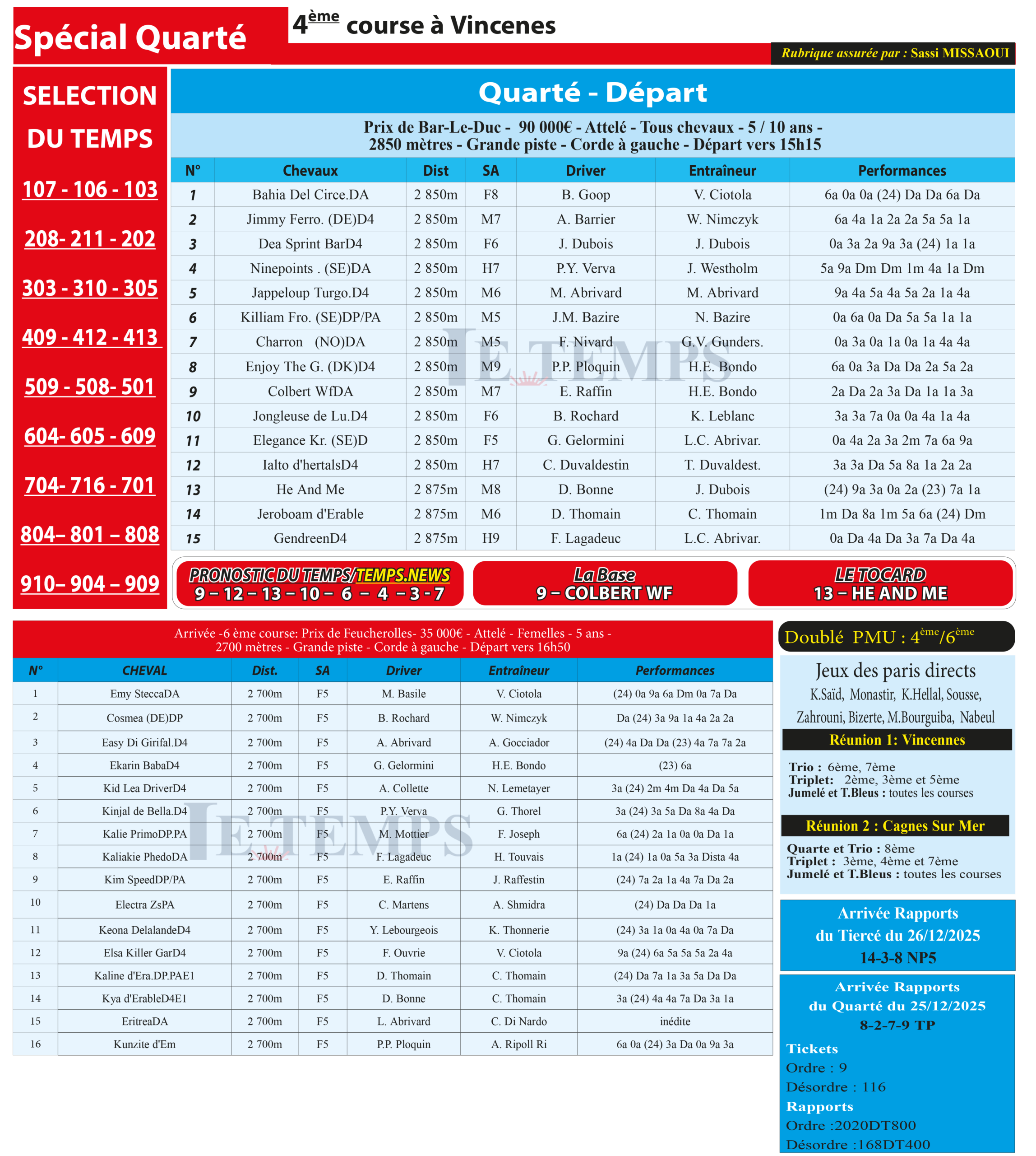 Notre spécial Quarté d’aujourd’hui, 4ème course à Vincennes, donne notre pronostic du Temps/ Temps News avec le cheval n°9 Colbert WF étant la base, tandis que le Tocard est le cheval n°13 He And Me.