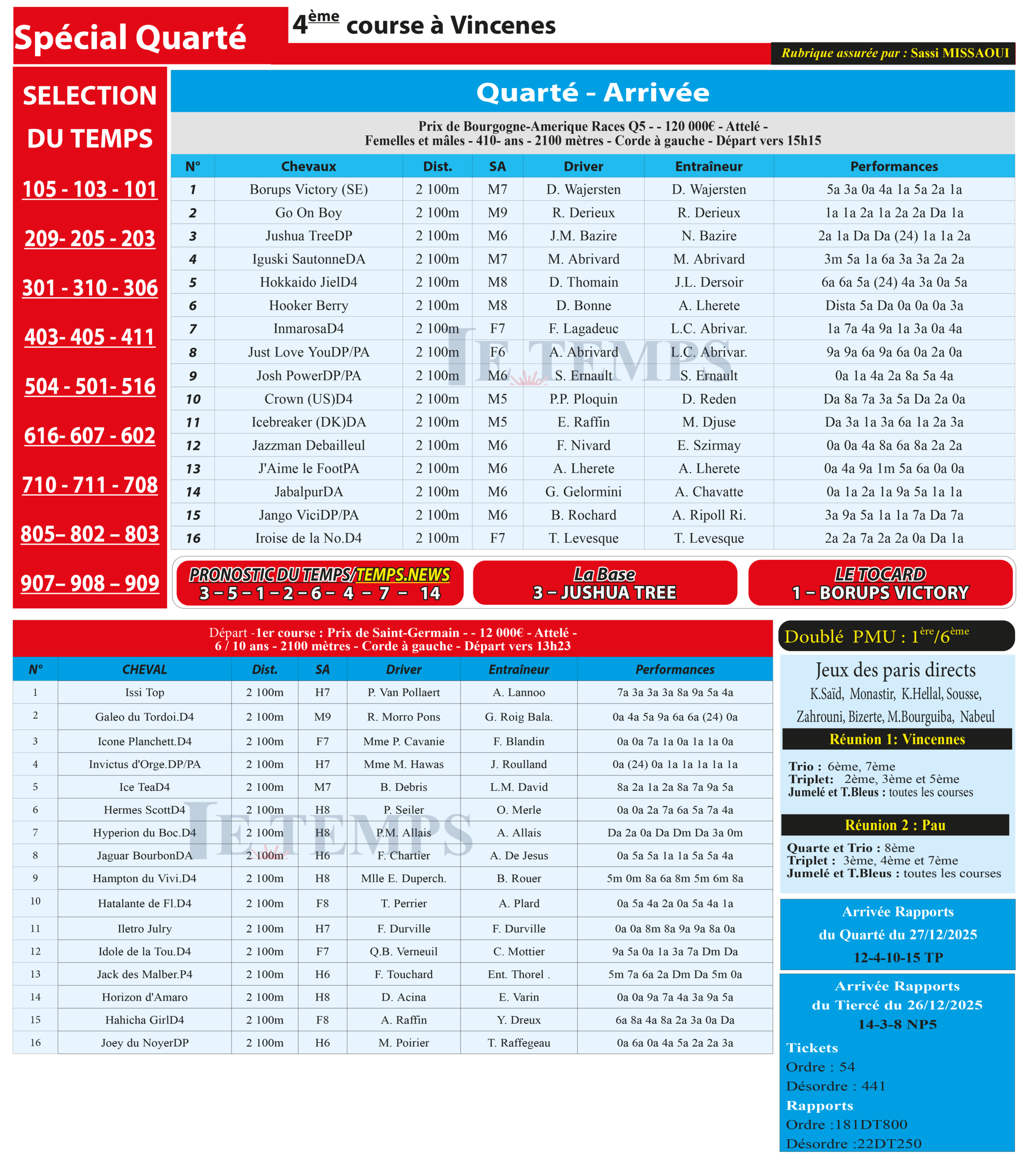 Partager Facebook Twitter LinkedIn Pinterest Email Notre spécial Quarté d’aujourd’hui, 4ème course à Vincennes, donne notre pronostic du Temps/ Temps News avec le cheval n°3 Jushua Tree étant la base, tandis que le Tocard est le cheval n°1 Borups Victory. PMU Turf