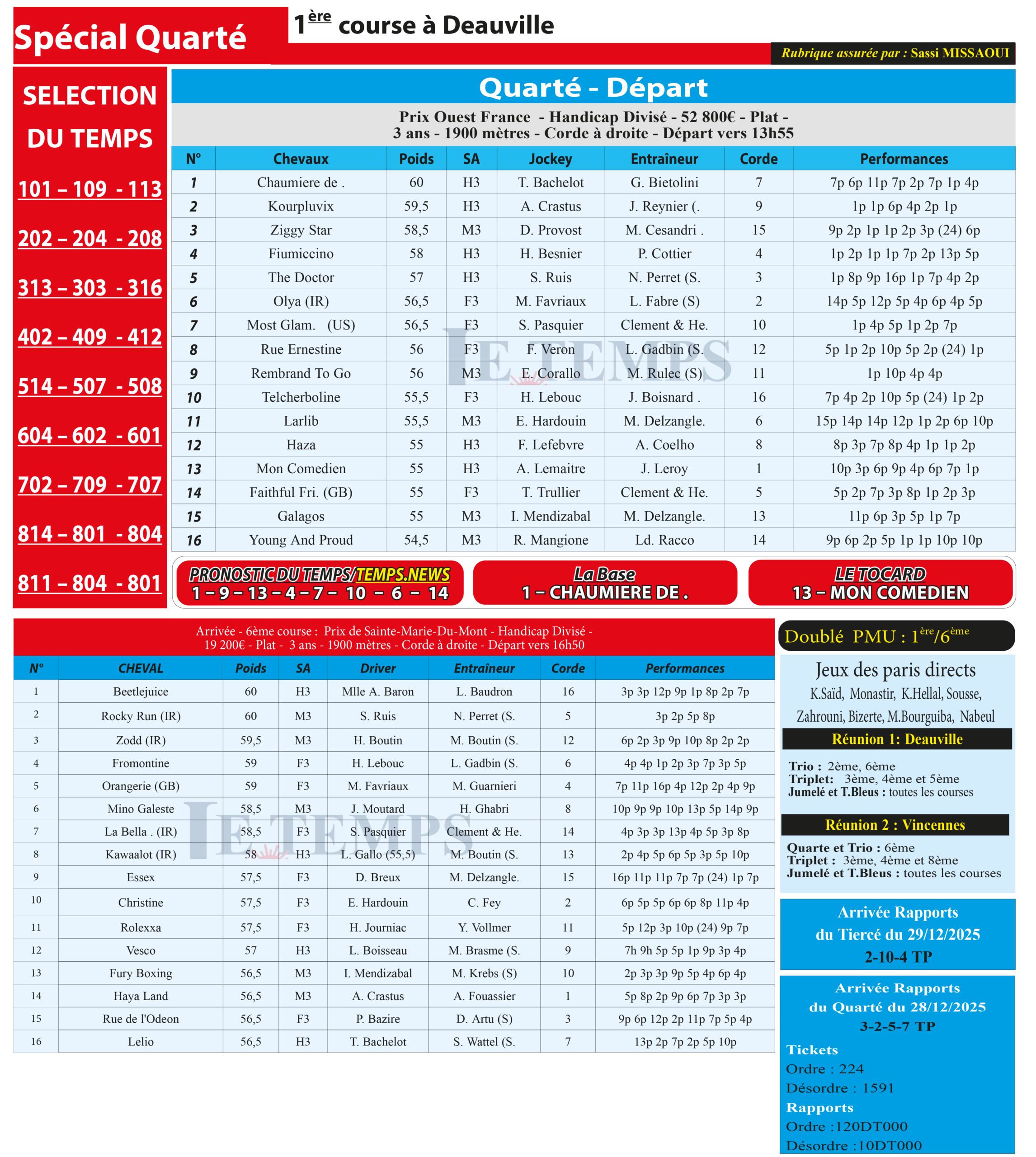 Notre spécial Quarté d’aujourd’hui, 1ère course à Deauville, donne notre pronostic du Temps/ Temps News avec le cheval n°1 Chaumiere De. étant la base, tandis que le Tocard est le cheval n°13  Mon Comedien.