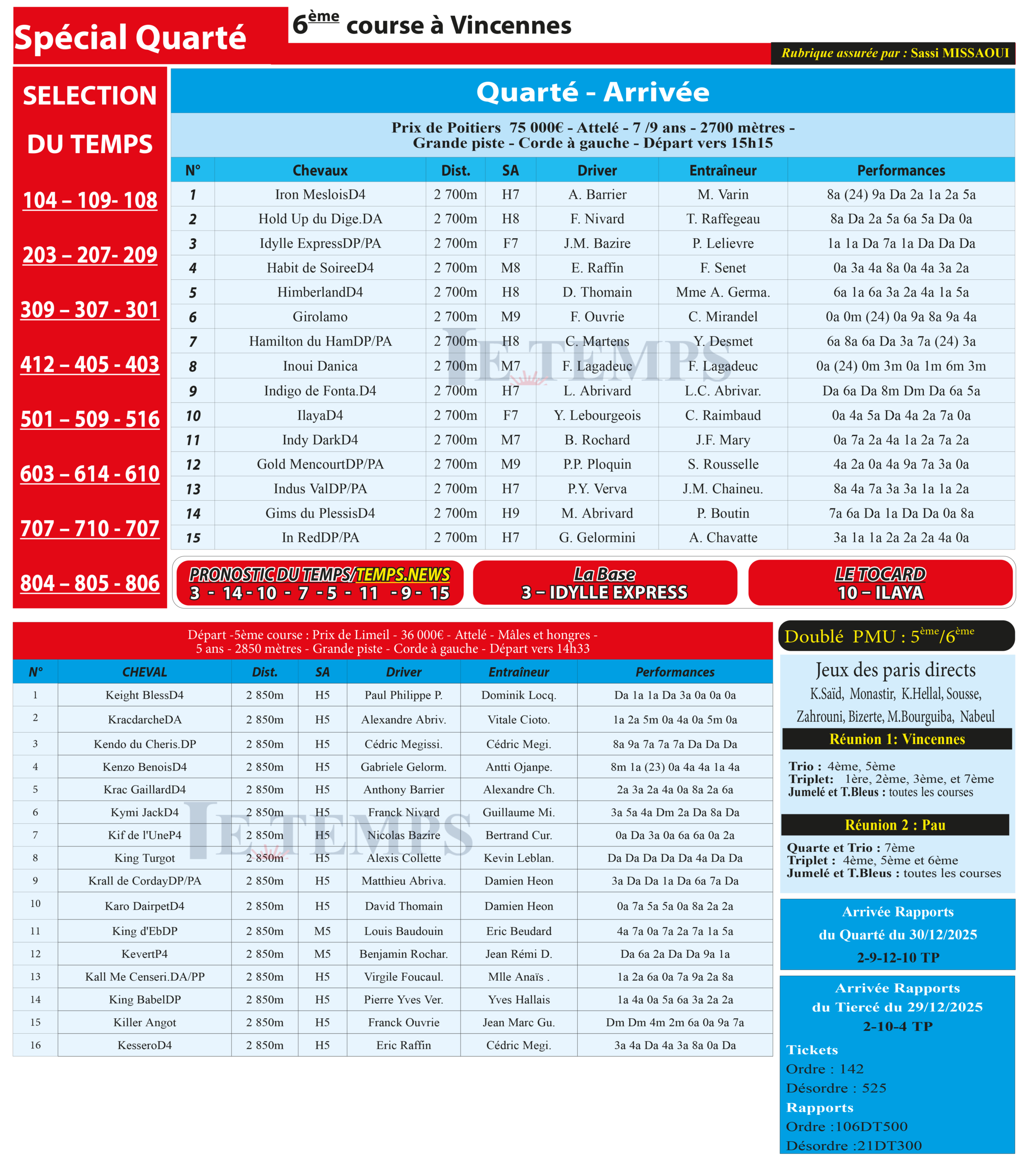 Partager Facebook Twitter LinkedIn Pinterest Email Notre spécial Quarté d’aujourd’hui, 4ème course à Vincennes, donne notre pronostic du Temps/ Temps News avec le cheval n°3 Idylle Express étant la base, tandis que le Tocard est le cheval n°10 Ilaya. PMU Turf