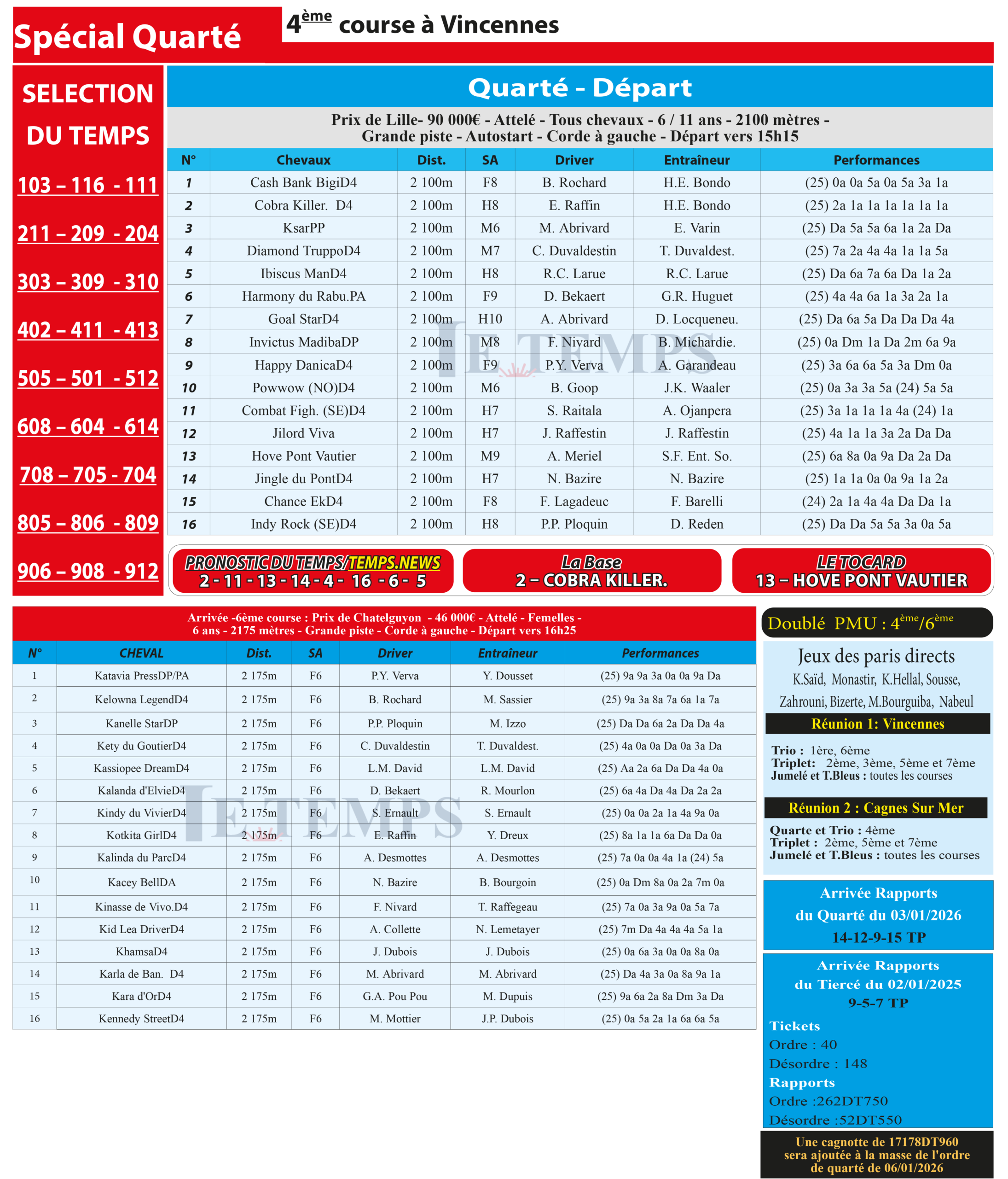 Partager Facebook Twitter LinkedIn Pinterest Email Notre spécial Quarté d’aujourd’hui, 4ème course à Vincennes, donne notre pronostic du Temps/ Temps News avec le cheval n°2 Cobra Killer étant la base, tandis que le Tocard est le cheval n°13 Hove Pont Vautier. PMU Turf
