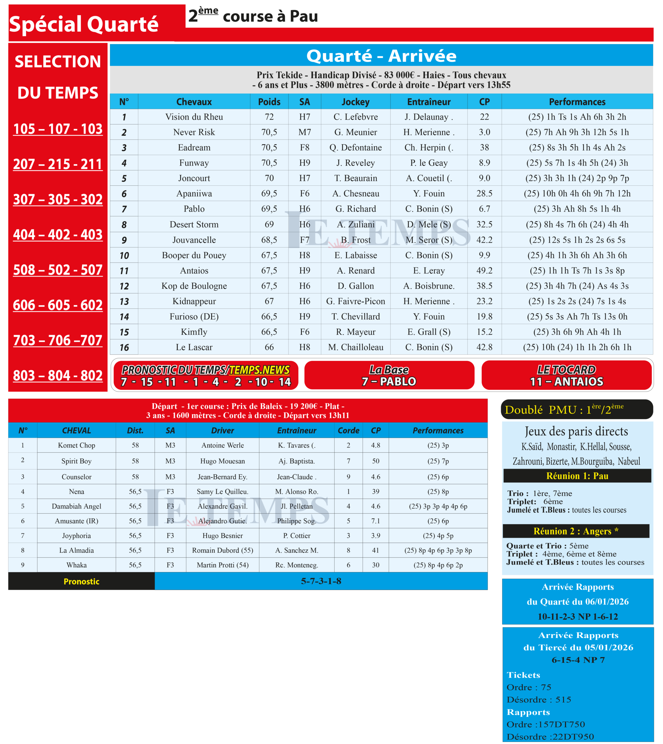 Partager Facebook Twitter LinkedIn Pinterest Email Notre spécial Quarté d’aujourd’hui, 2ème course à Pau, donne notre pronostic du Temps/ Temps News avec le cheval n°7 Pablo la base, tandis que le Tocard est le cheval n°11 Antaios. PMU Turf