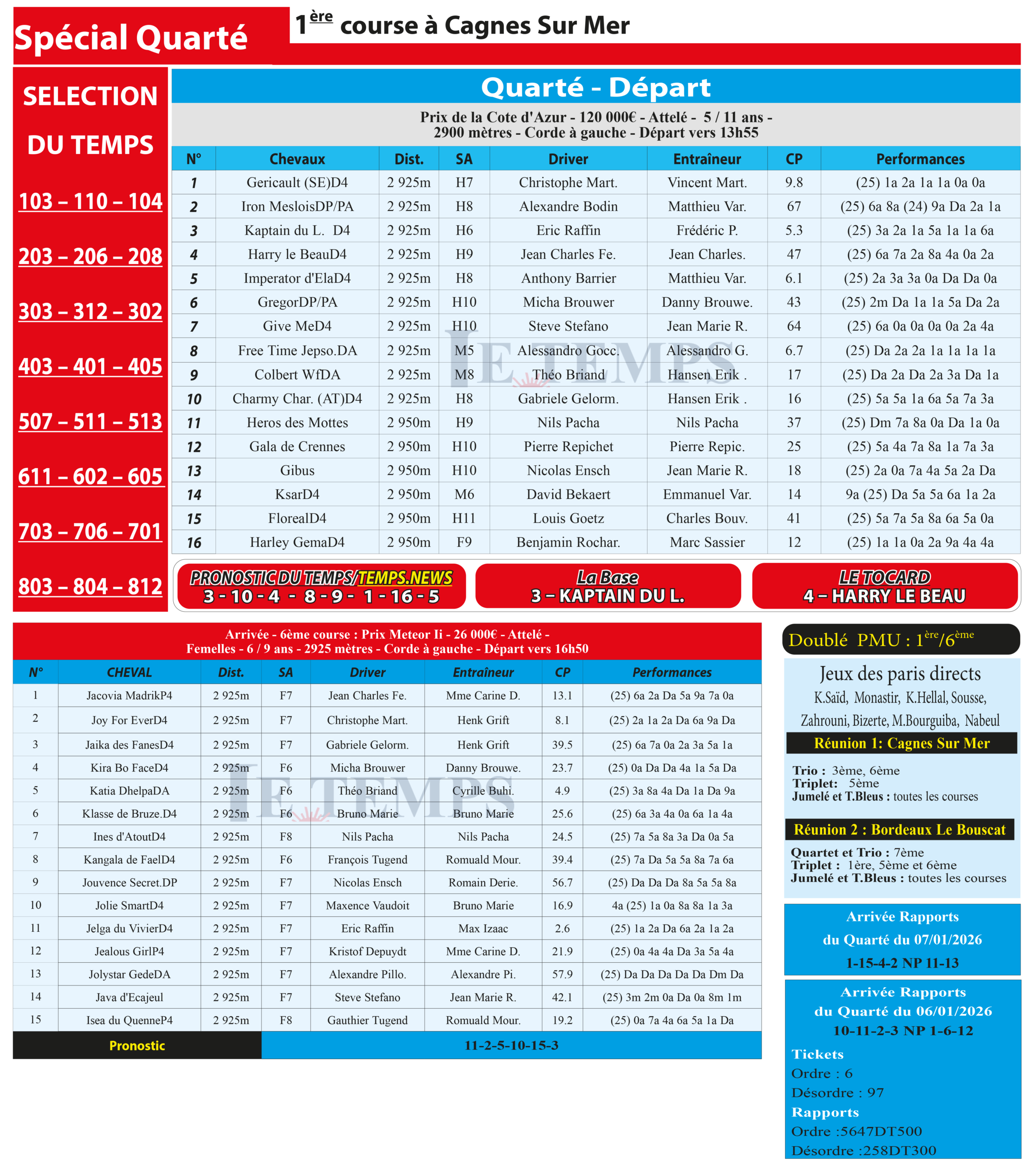 Partager Facebook Twitter LinkedIn Pinterest Email Notre spécial Quarté d’aujourd’hui, 1ère course à Cagnes Sur Mer, donne notre pronostic du Temps/ Temps News avec le cheval n°3 Kaptain du L. étant la base, tandis que le Tocard est le cheval n°4 GimHarry le Beau. PMU Turf