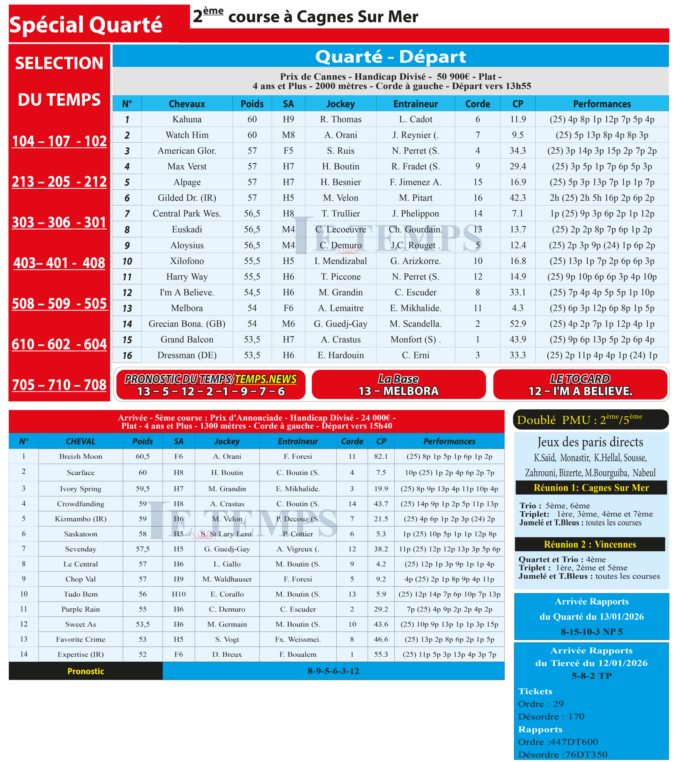 Partager Facebook Twitter LinkedIn Pinterest Email Notre spécial Quarté d’aujourd’hui, 2ème course à Cagnes Sur Mer, donne notre pronostic du Temps/ Temps News avec le cheval n°13 Melbora étant la base, tandis que le Tocard est le cheval n°12 I’m A Believe. PMU Turf