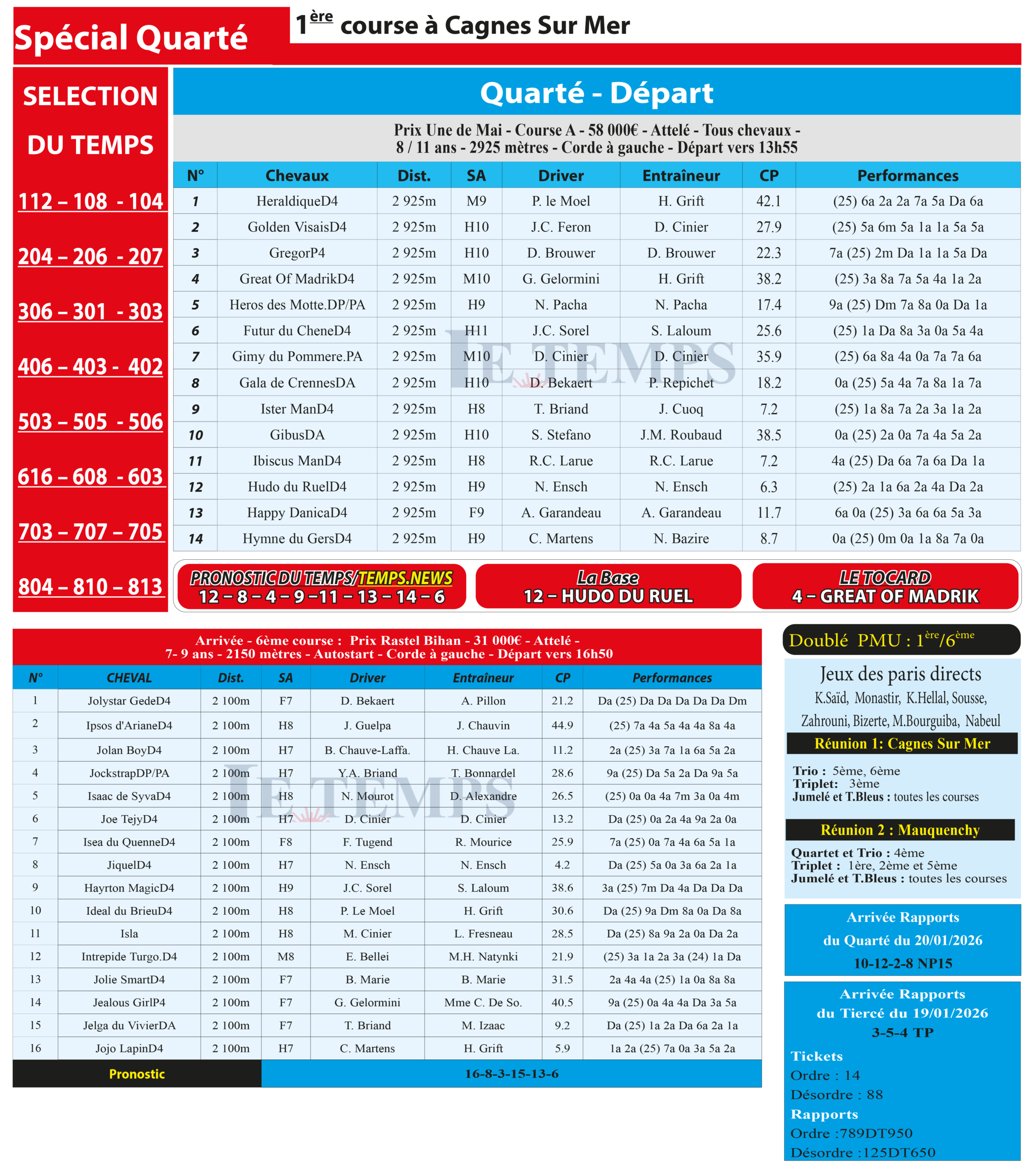 Notre spécial Quarté d’aujourd’hui, 1ère course à Cagnes Sur Mer, donne notre pronostic du Temps/ Temps News avec le cheval n°12 Hudo Du Ruel  étant la base, tandis que le Tocard est le cheval n°4 Great Of Madrik.