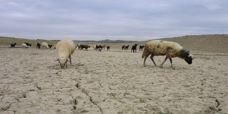 Éleveur tunisien dans une zone rurale aride, entouré de bétail amaigri, sol craquelé par la sécheresse.