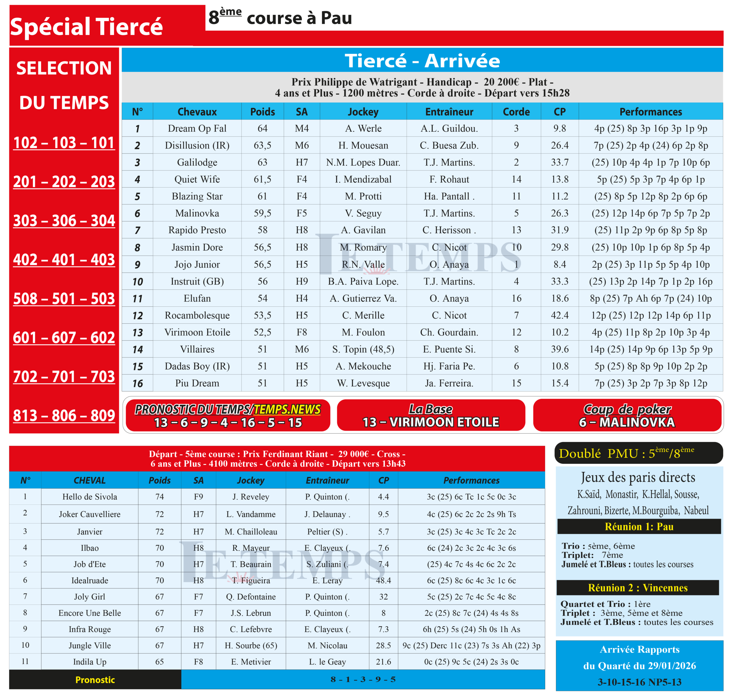 Notre spécial Quarté d’aujourd’hui, 8ème course à Pau, donne notre pronostic du Temps/ Temps News :