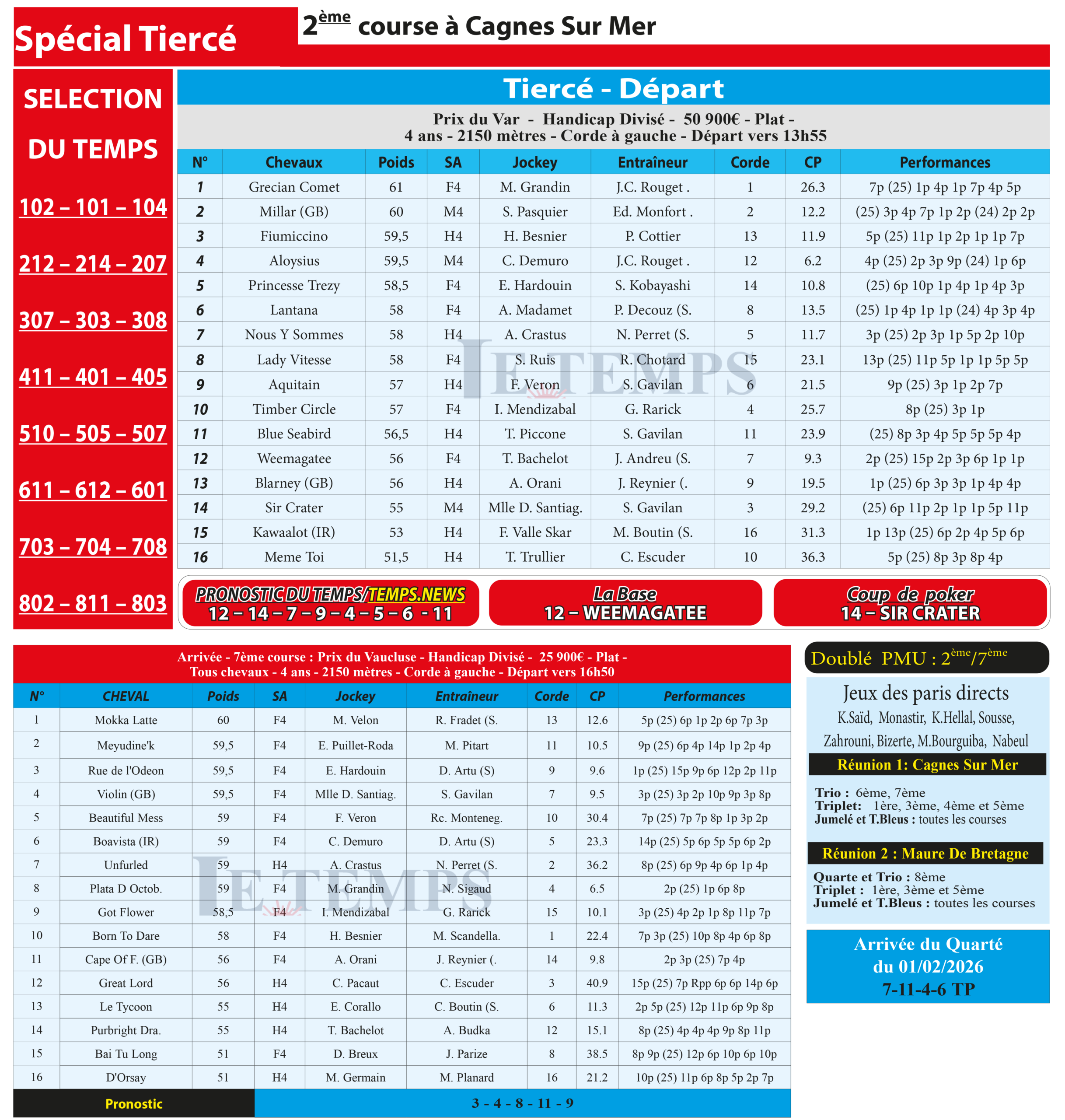 Notre spécial Tiercé d’aujourd’hui, 2ème course à Cagnes-sur-Mer, donne notre pronostic du Temps/ Temps News; Weemagatee (12) est la base solide, idéalement engagé en seconde ligne à Pau, avec les moyens de faire parler sa tenue pour jouer la victoire jusqu’au bout.