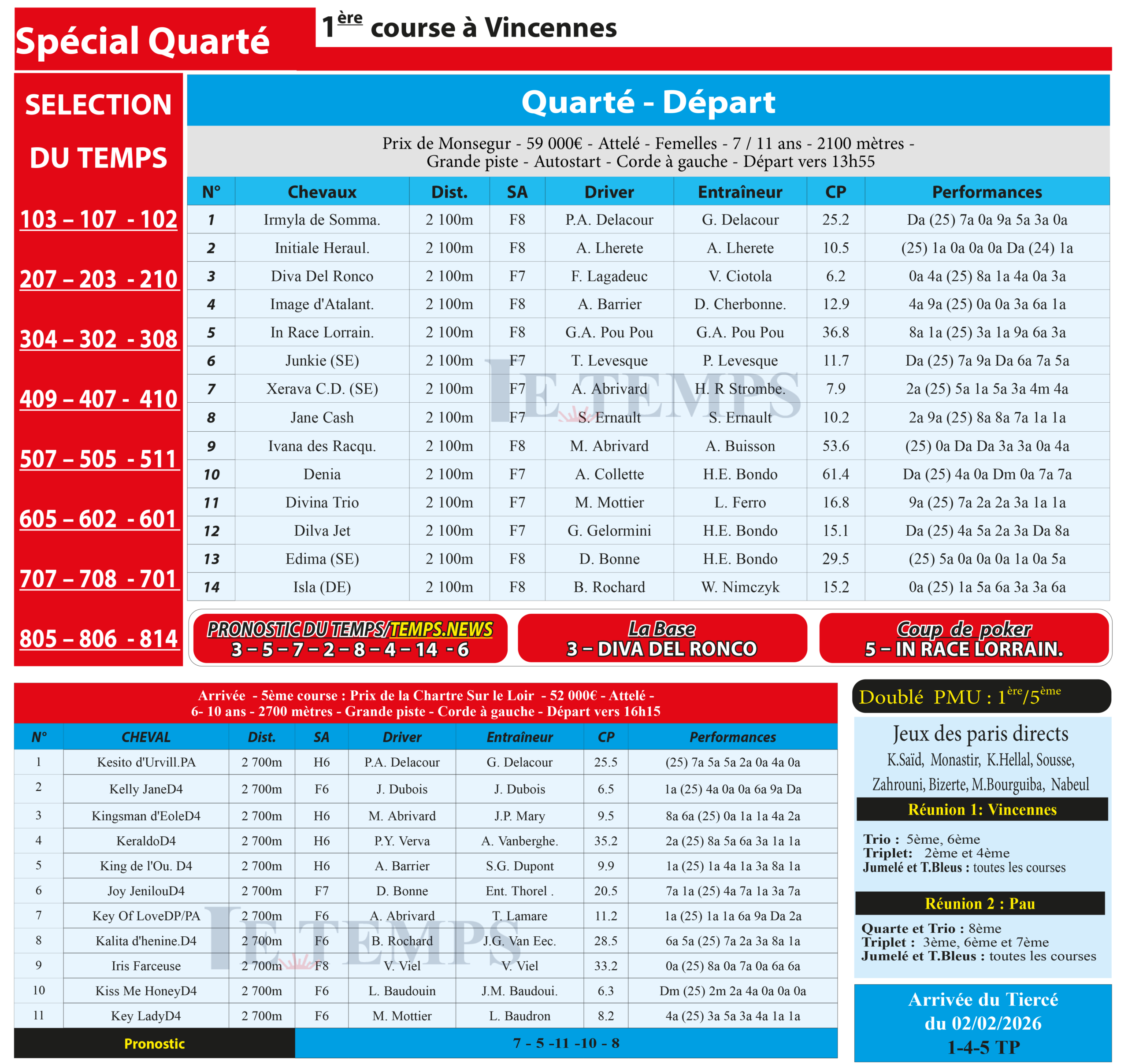 Notre spécial Quarté d’aujourd’hui, 1ère course à Vincennes, donne notre pronostic du Temps/ Temps News; Diva Del Ronco (3) est la base solide, référence du lot sur ce parcours, déjà lauréate d’un Quinté+ ici dans un chrono canon, idéalement engagée face aux seules femelles avec un excellent numéro.