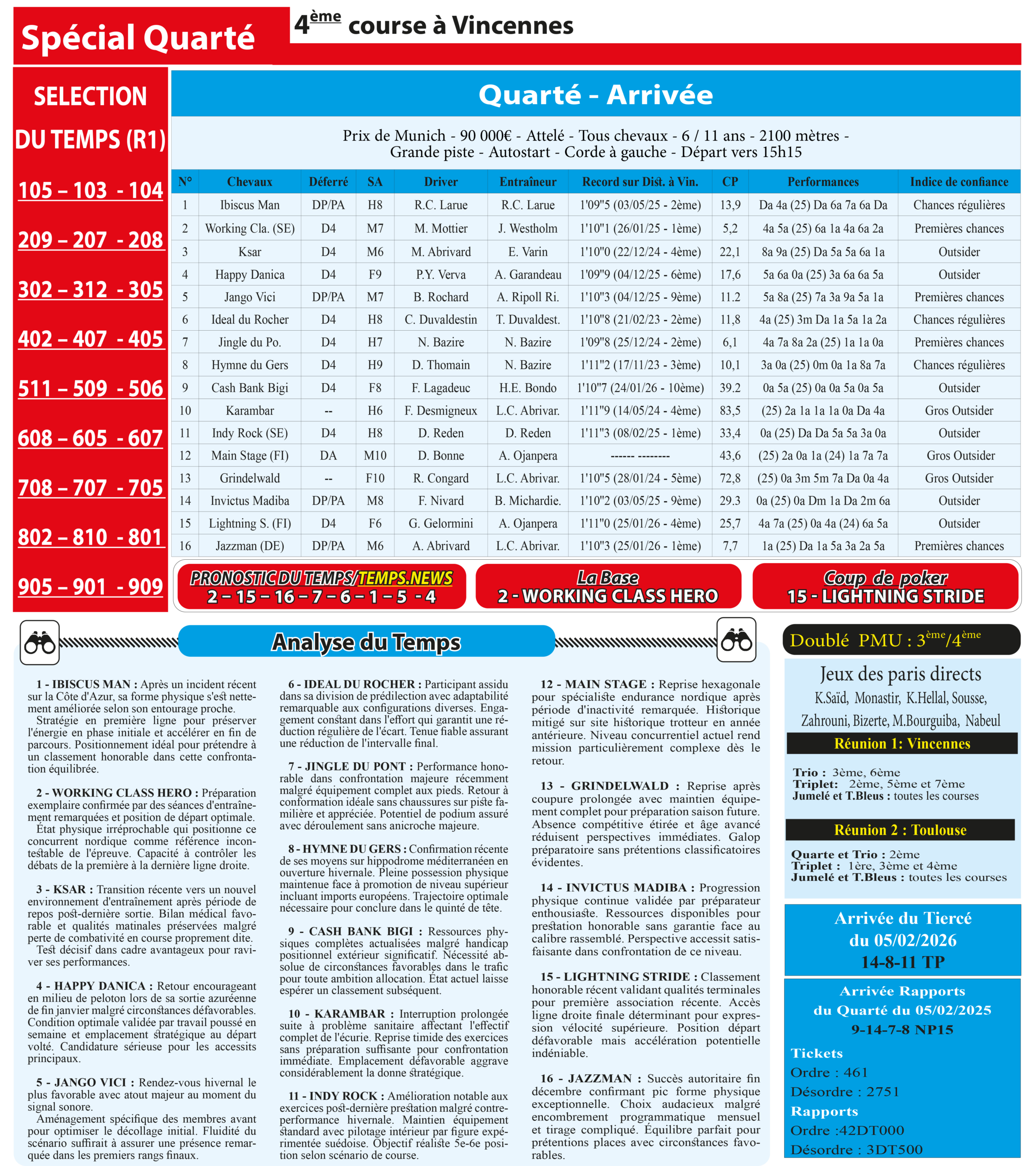 Notre spécial Quarté d’aujourd’hui, 4ème course à Vincennes, donne notre pronostic du Temps/ Temps News; Working Class Hero (2) : la base absolue, en pleine condition et idéalement engagé derrière la ligne, ce scandinave au top de sa forme a tous les atouts pour dicter sa loi d’un bout à l’autre du parcours.