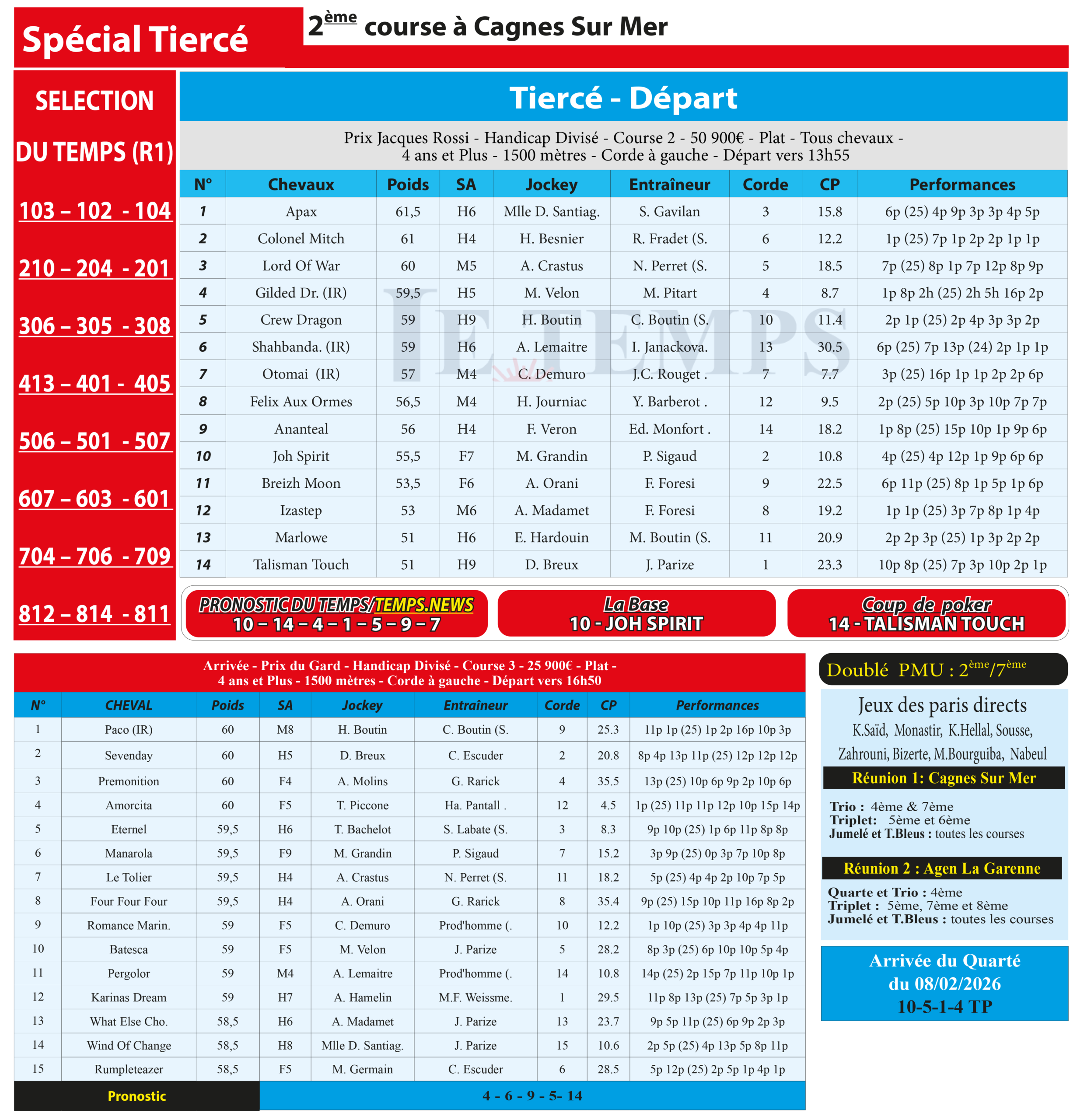 Notre spécial Tiercé d’aujourd’hui, 2ème course à Cagnes Sur Mer, donne notre pronostic du Temps/ Temps News; Joh Spirit (10) est la base solide, idéalement engagée en seconde ligne, avec les moyens de faire parler sa tenue pour jouer la victoire jusqu’au bout.