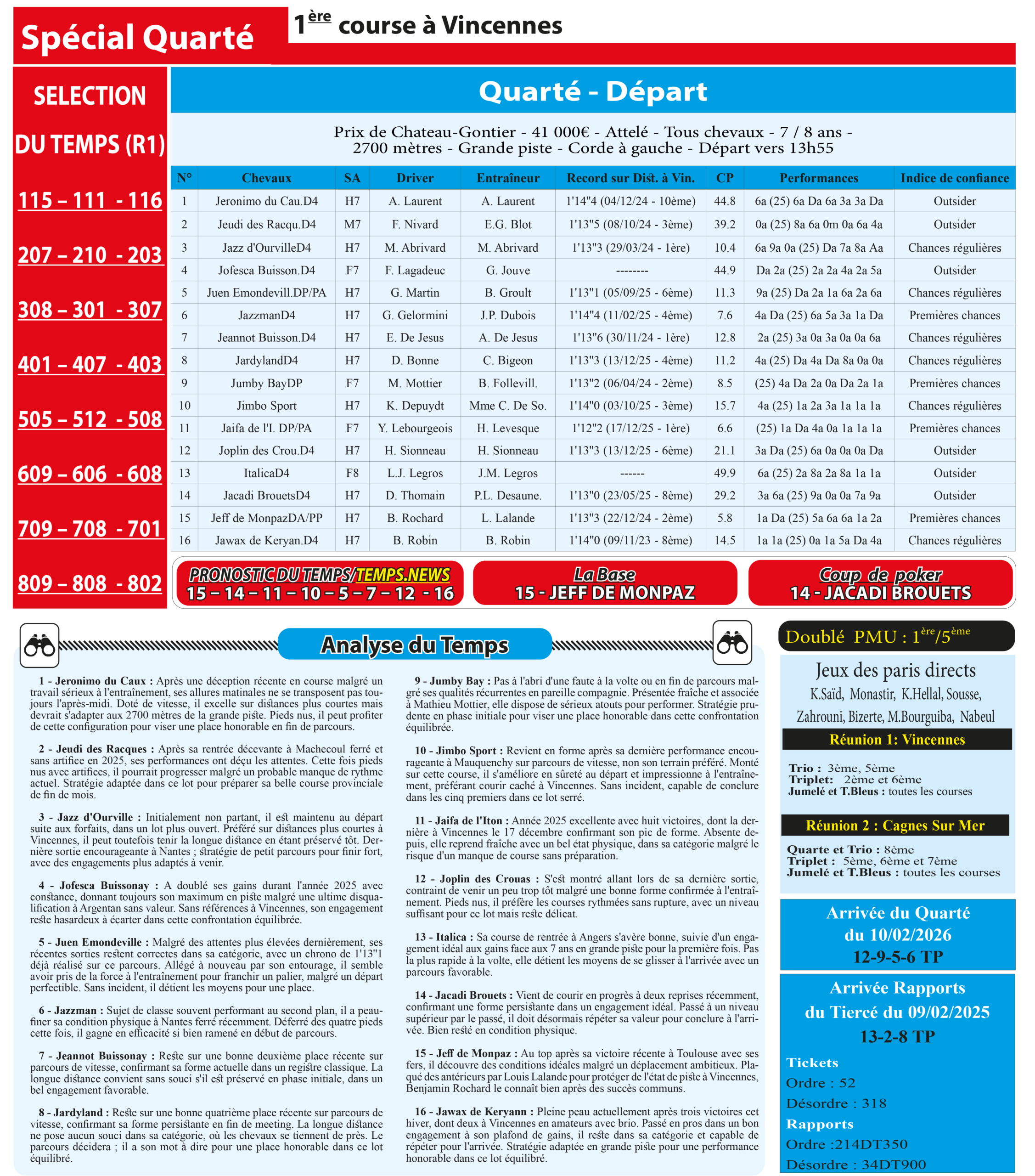Notre spécial Quarté d’aujourd’hui, 1ère course à Vincennes, donne notre pronostic du Temps/ Temps News;  15 – Jeff de Monpaz : la base absolue, au top de sa forme après victoire à Toulouse et idéalement engagé, plaqué antérieurs sur piste fragile avec tous atouts réunis, il a tout pour dicter sa loi d’un bout à l’autre du parcours.
