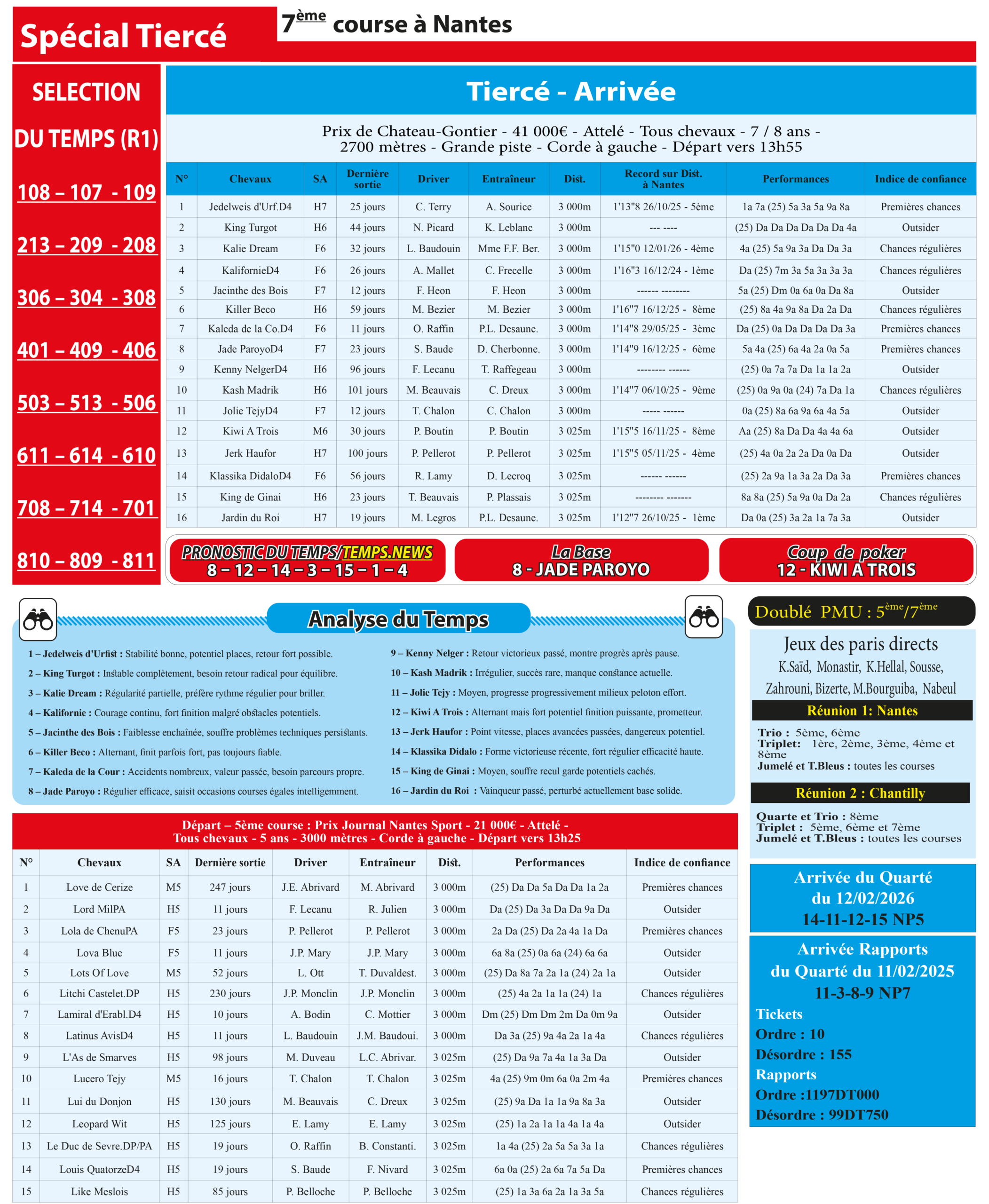 Notre spécial Quarté d’aujourd’hui, 7ème course à Nantes, donne notre pronostic du Temps/ Temps News;  8 – Jade Paroyo : la base absolue, au top de sa forme récente et idéalement engagée à Nantes, plaqués antérieurs sur piste fragile avec tous atouts réunis, elle a tout pour dicter sa loi d’un bout à l’autre du parcours.