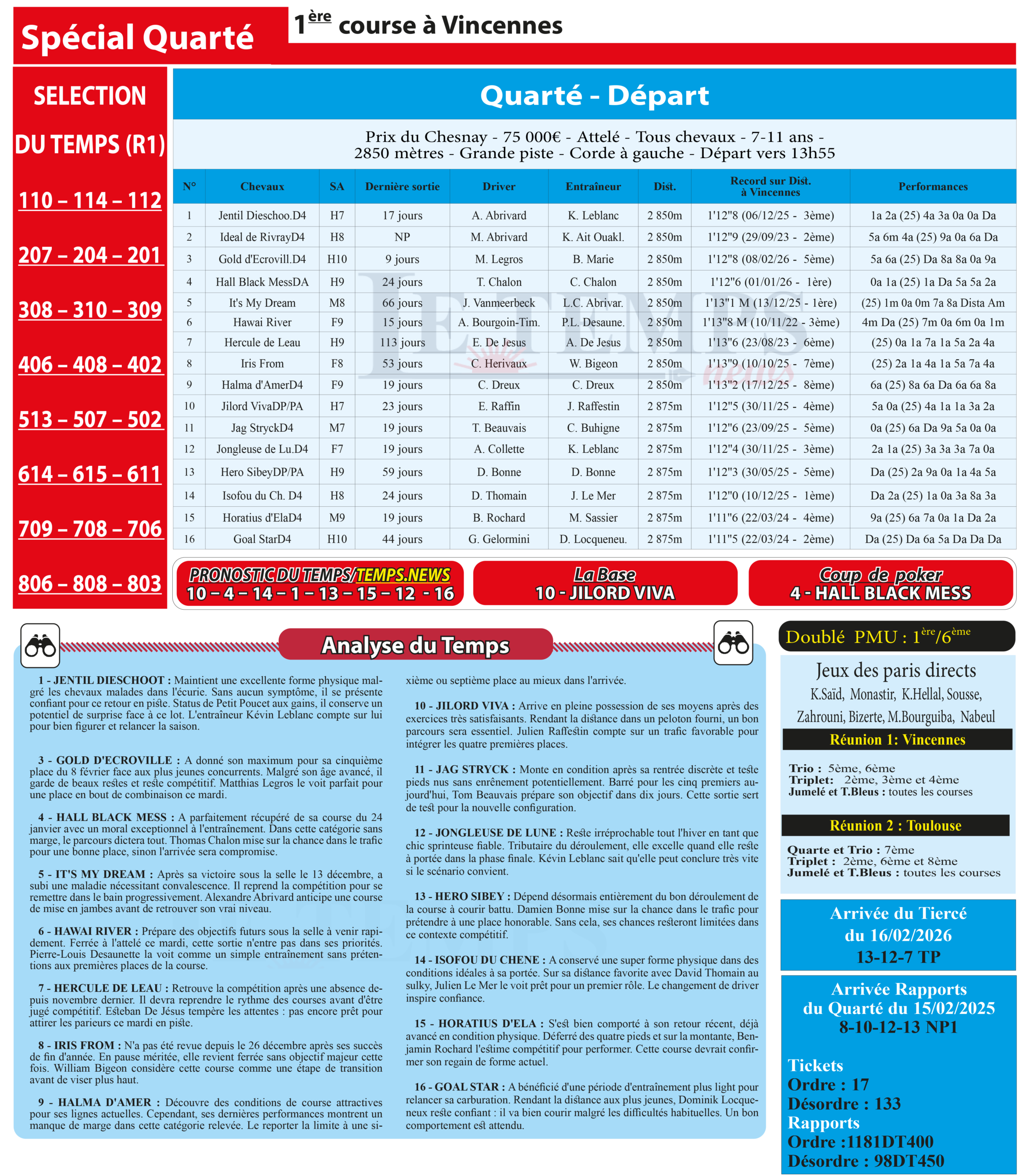 Le reste du jeu (14-1-13-15-12-16) : Isofou du Chêne (14) sur la montante avec engagement idéal, Jentil Dieschoot (1) influx plein malgré Petit Poucet, Hero Sibey (13) rentrée convaincante condition haute, Horatius d’Ela (15) préparation solide rythme retrouvé, Jongleuse de Lune (12) premières chances podium régularité optimisée, Goal Star (16) moteur solide en progression.